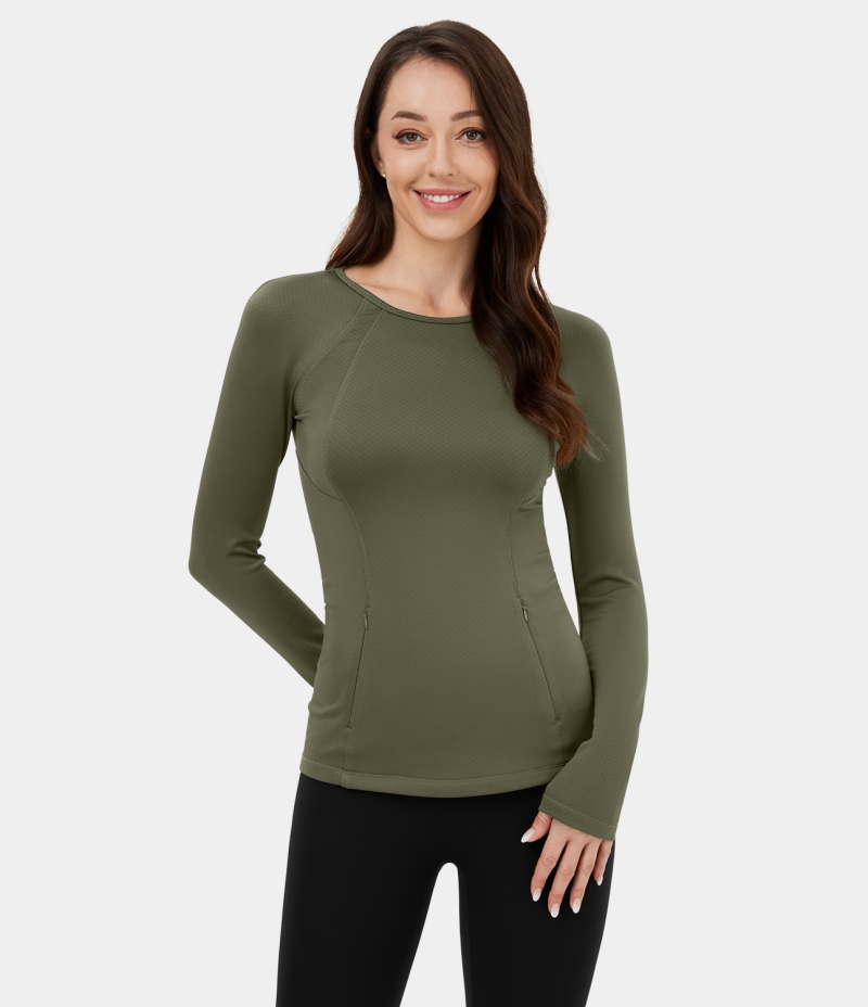 Halara 3D Fleece Round Neck Side Zip Pocket Fleece Bodycon Casual Sports Sweatshirt Women's Tops Winter Moss | PKXYOCD-52
