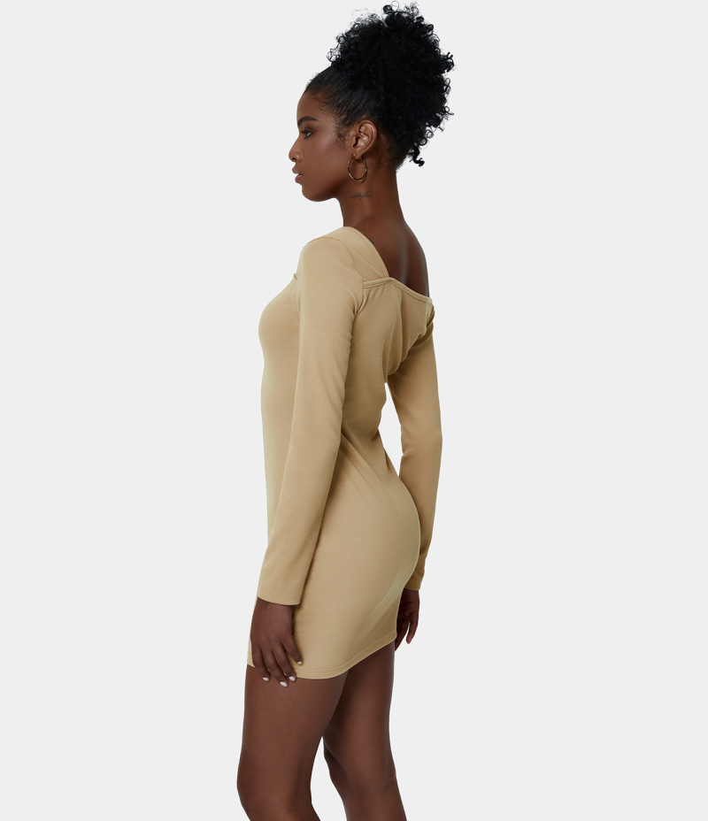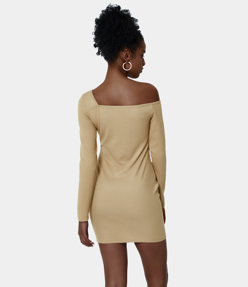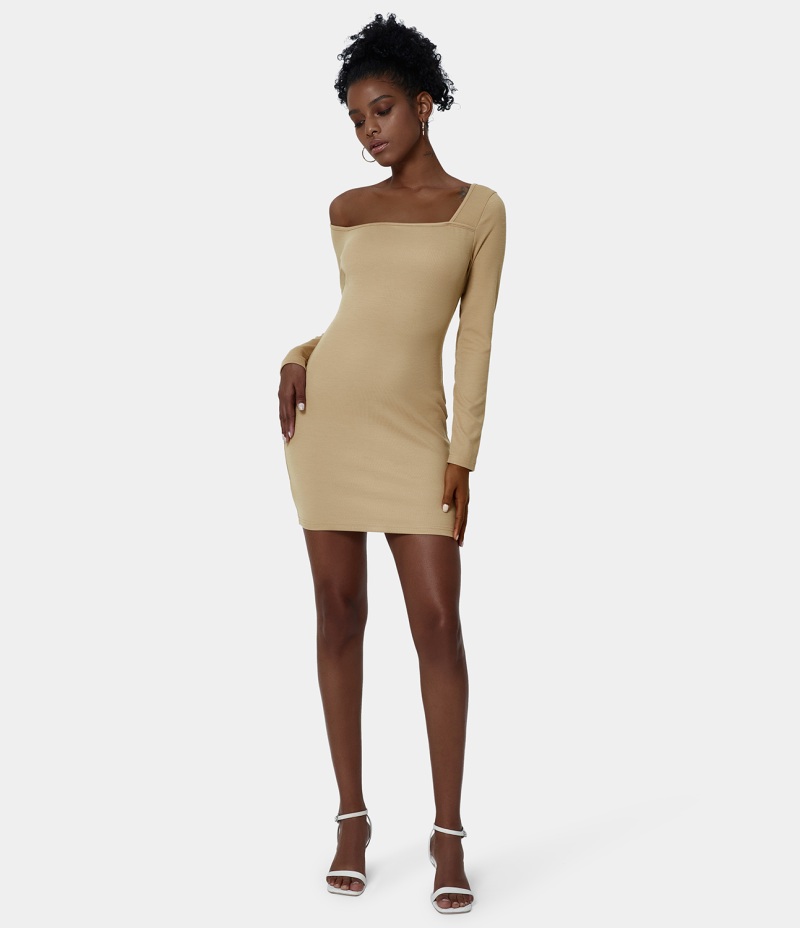 :: Halara Asymmetric Neck Long Sleeve Mini Bodycon Women's Dress Khaki | 475028-IDB