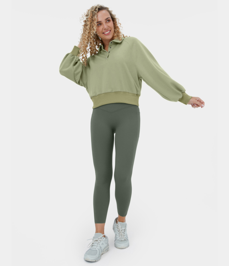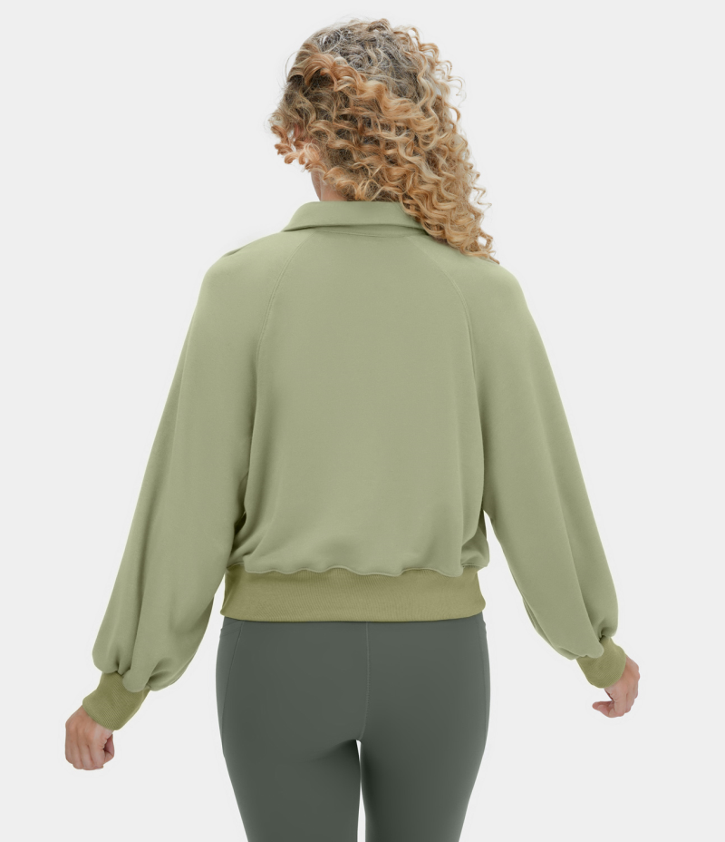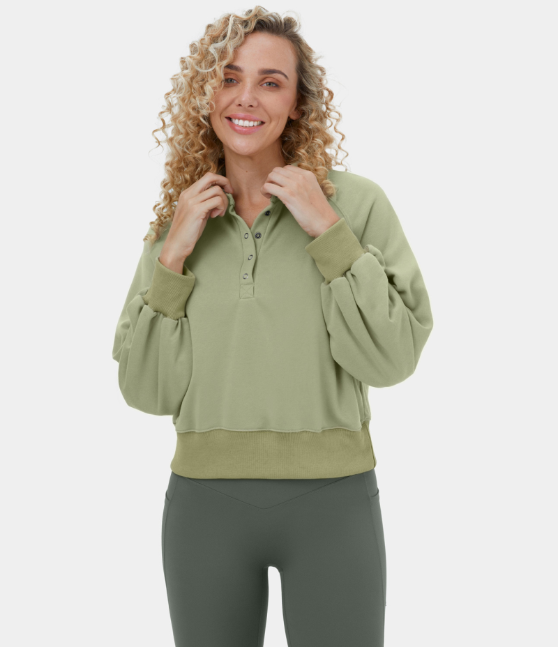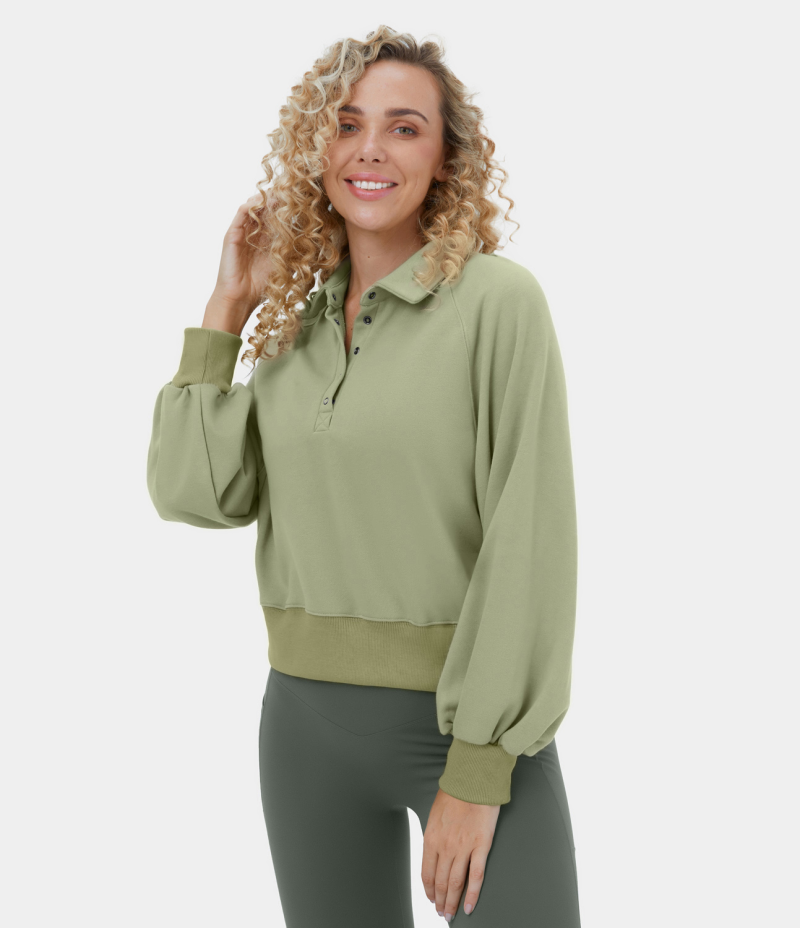 :: Halara Collared Button Bishop Sleeve Cropped Casual Sports Sweatshirt Women's Tops Tea | HCTZJIR-71