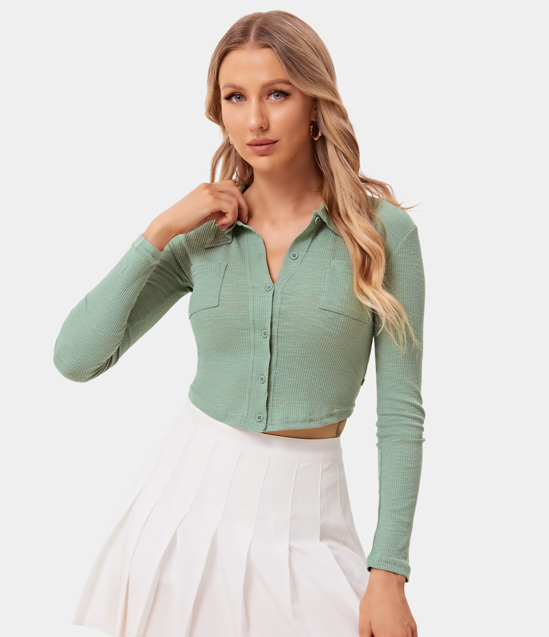 :: Halara Collared Button Front Cropped Knit Women's Tops Seagrass | HSQZIET-81
