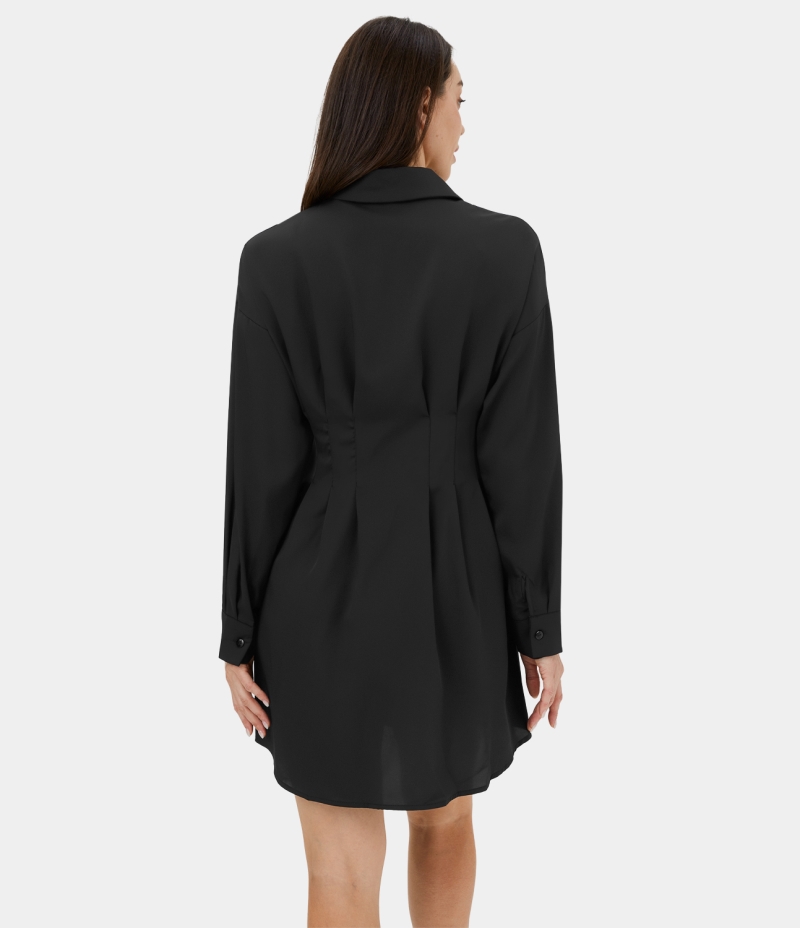 :: Halara Collared Button Front Plicated Mini Casual Shirt Women's Dress Black | 674250-WMX