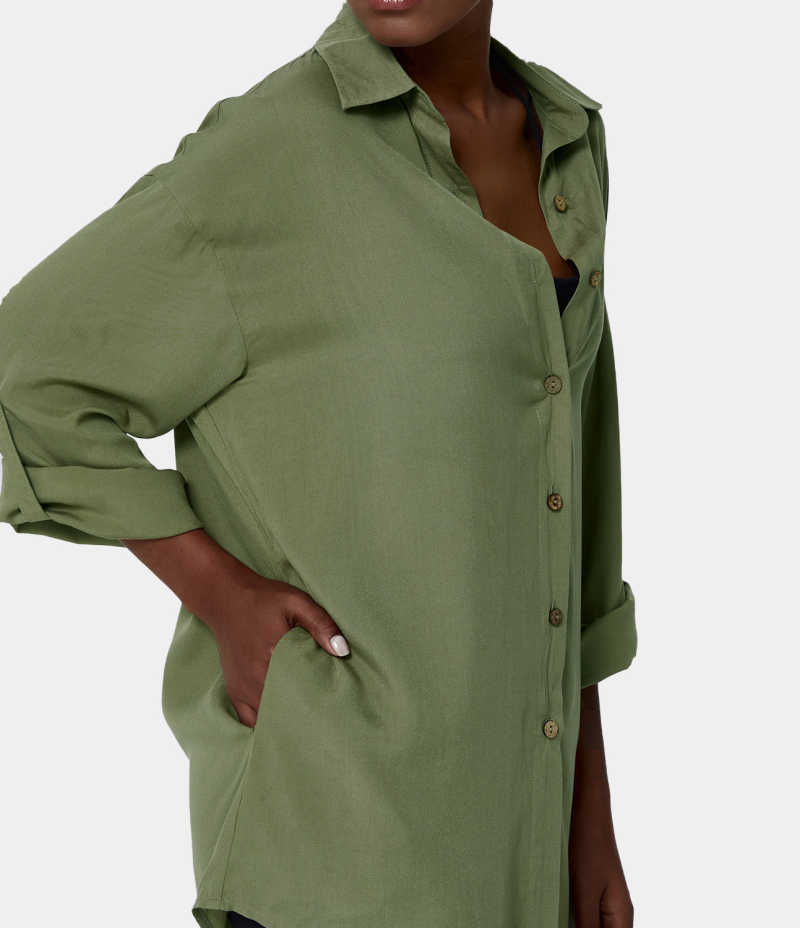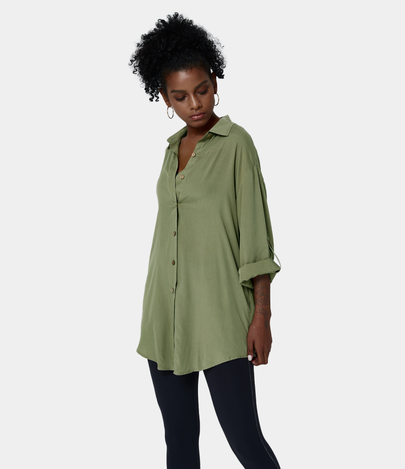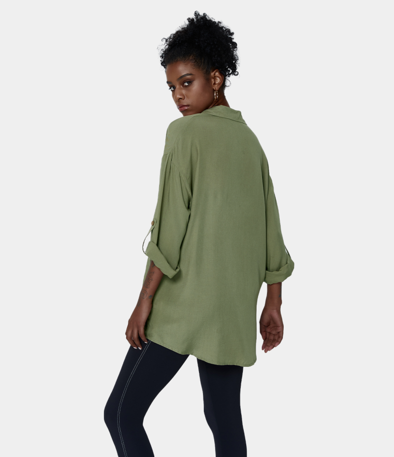 Halara Collared Button Front Roll Up Sleeve Plain Shirt Women's Tops Moss Green | BDMRLNC-42