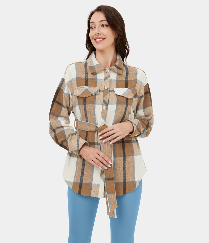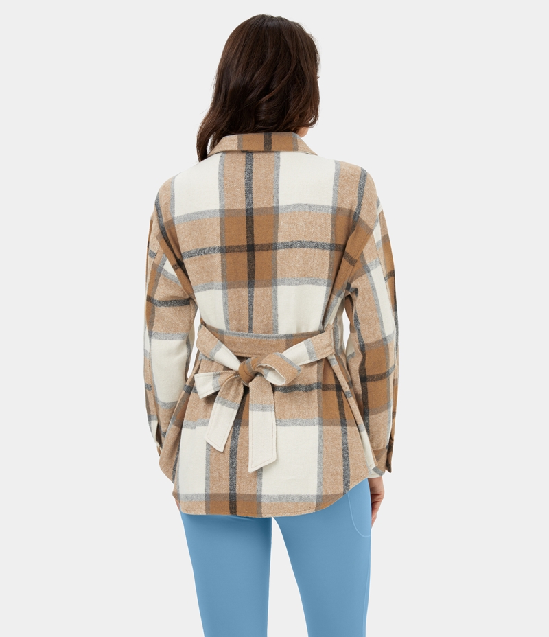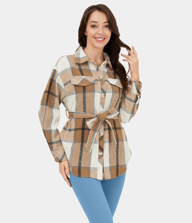 Halara Collared Button Lace Up Plaid Fleece Casual Jacket Women's Tops Khaki Plaid | ALDKSRW-39