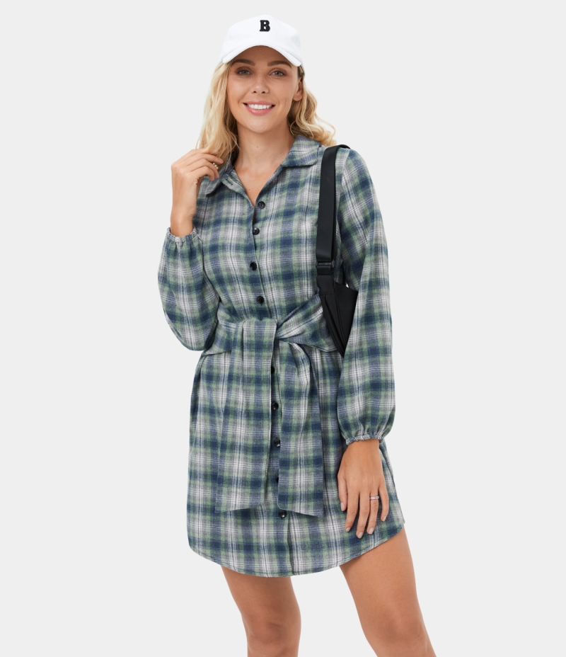 :: Halara Collared Button Lace Up Plaid Mini Casual Women's Dress Grey Green Plaid | 879603-UPJ