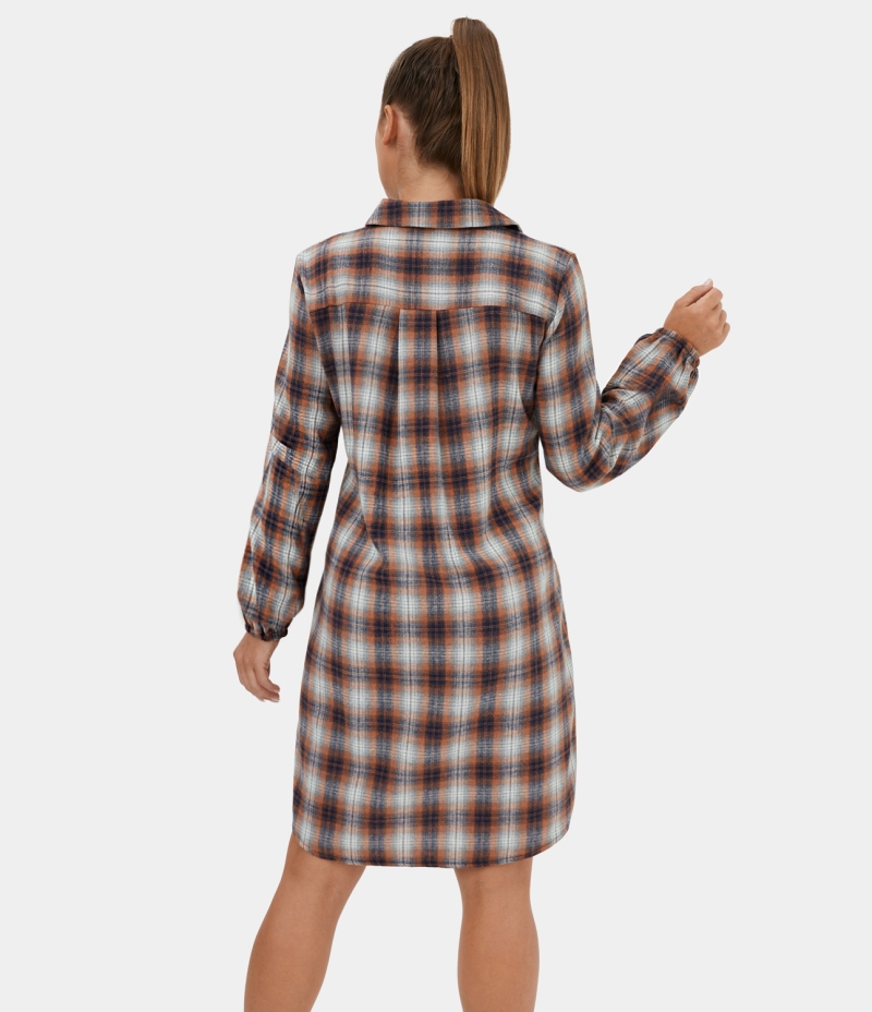 :: Halara Collared Button Lace Up Plaid Mini Casual Women's Dress Orange Grey Plaid | 910428-IXO