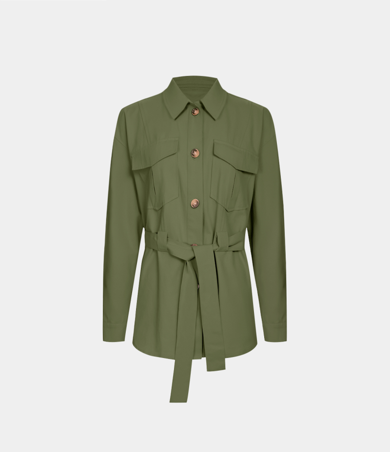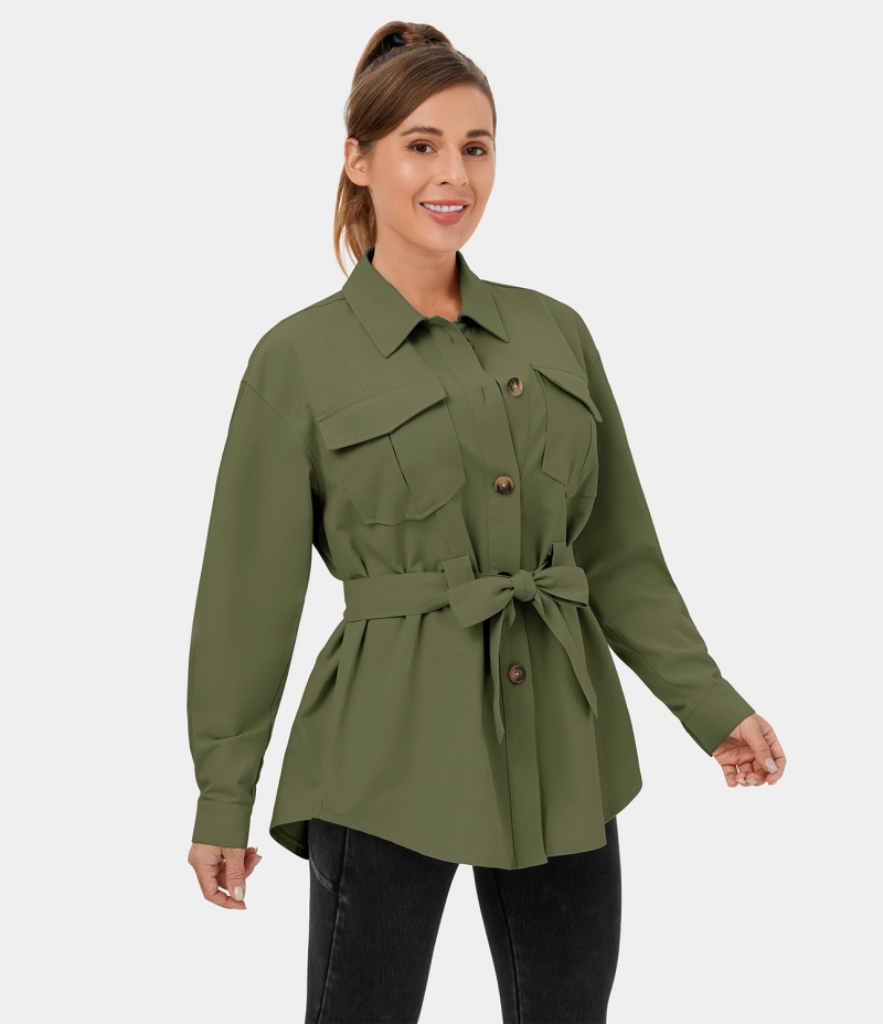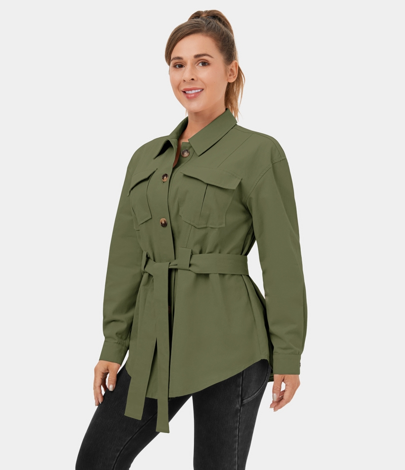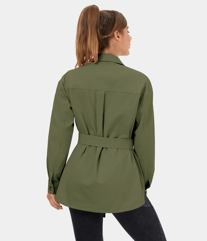 :: Halara Collared Button Lace Up Pocket Casual Cargo Jacket Women's Tops Olive Branch | VNAITFG-90