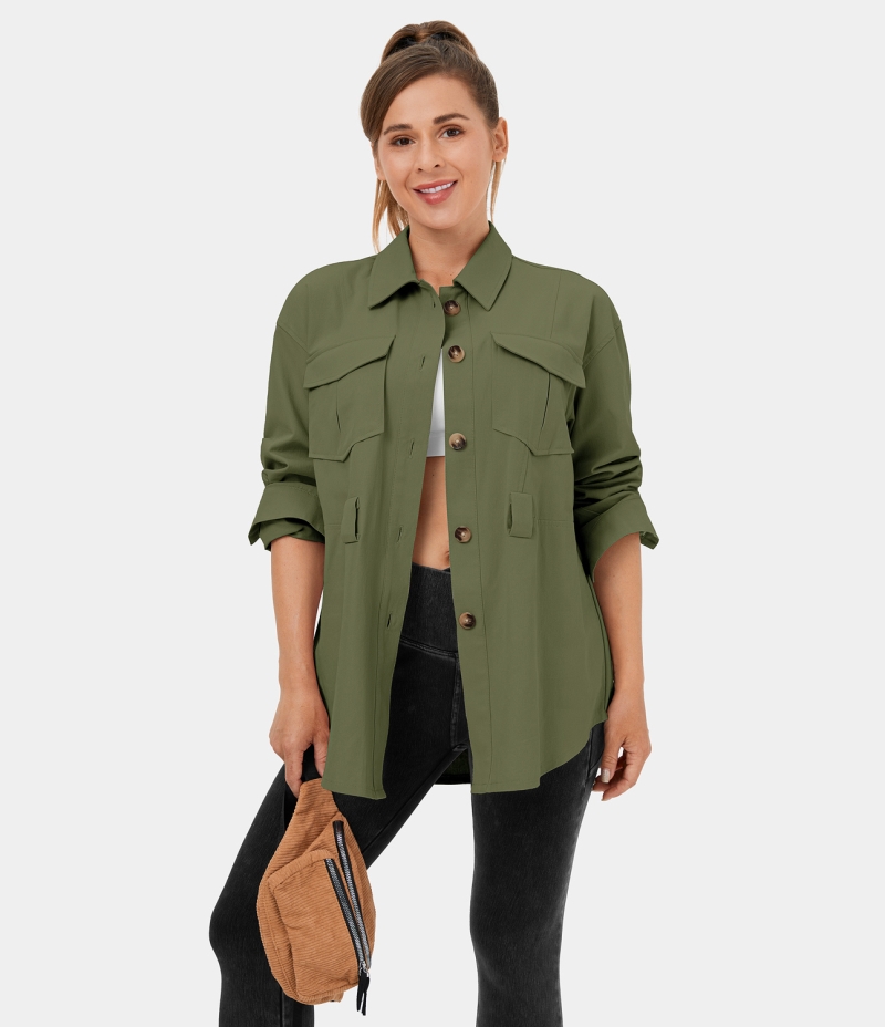 Halara Collared Button Lace Up Pocket Casual Cargo Jacket Women's Tops Olive Branch | VNAITFG-90