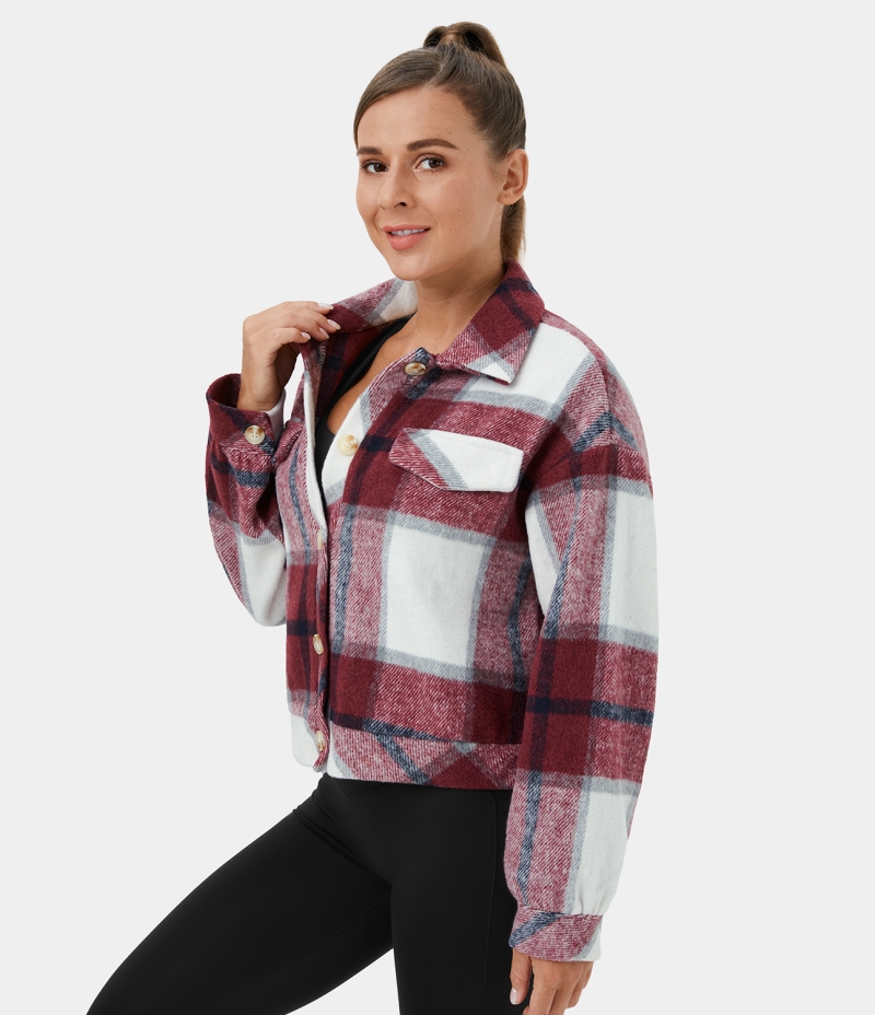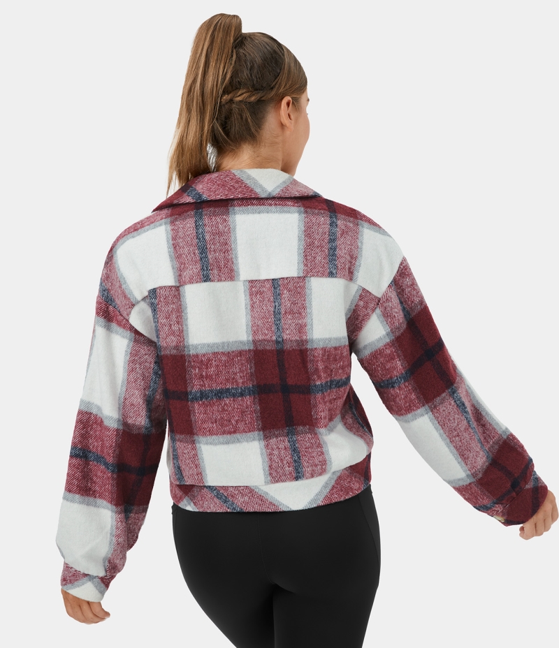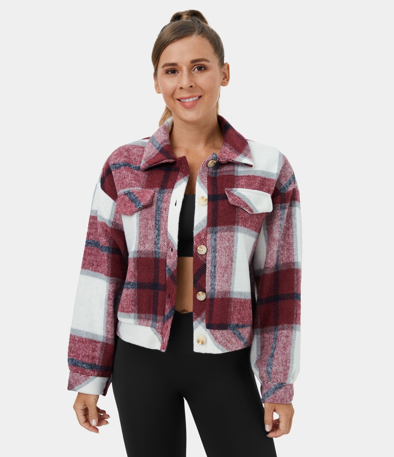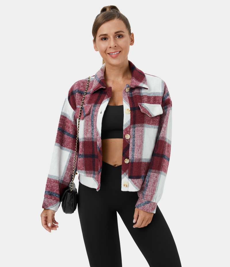 Halara Collared Button Plaid Cropped Casual Jacket Women's Tops Red Grey Plaid | YXJTBCU-45