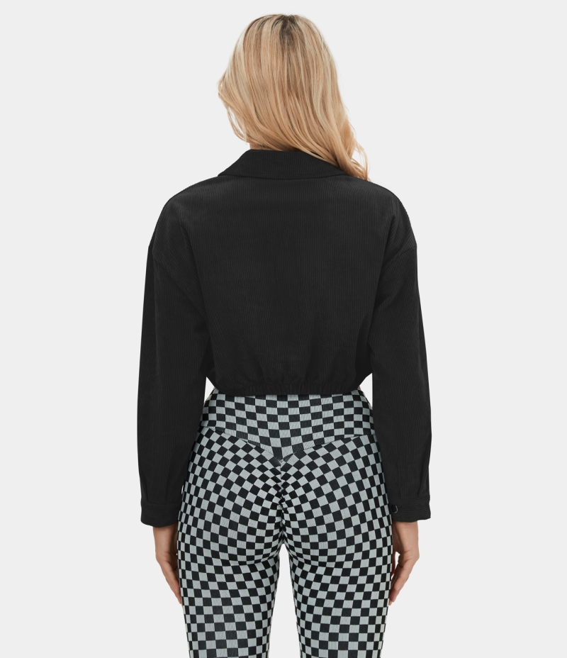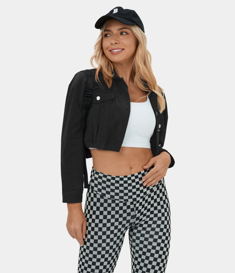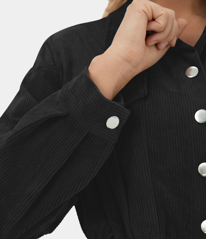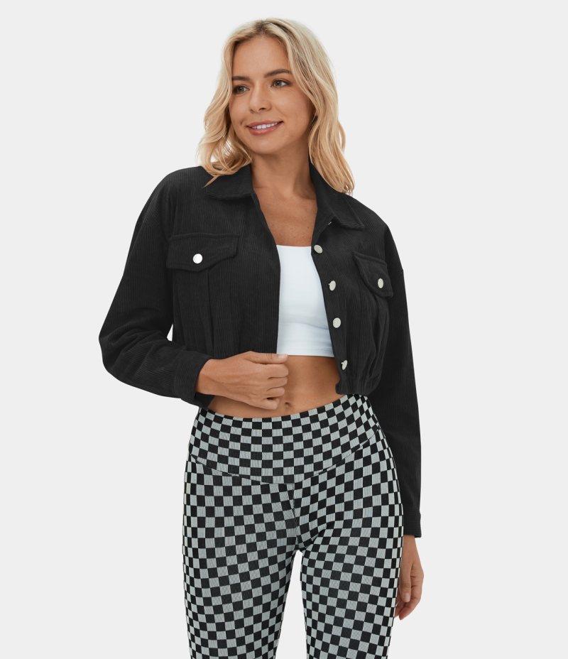 Halara Collared Button Pocket Cropped Corduroy Casual Jacket Women's Tops Black | NJOQVYP-89