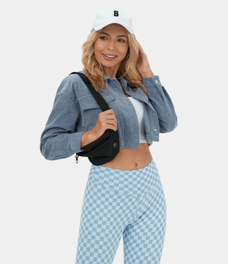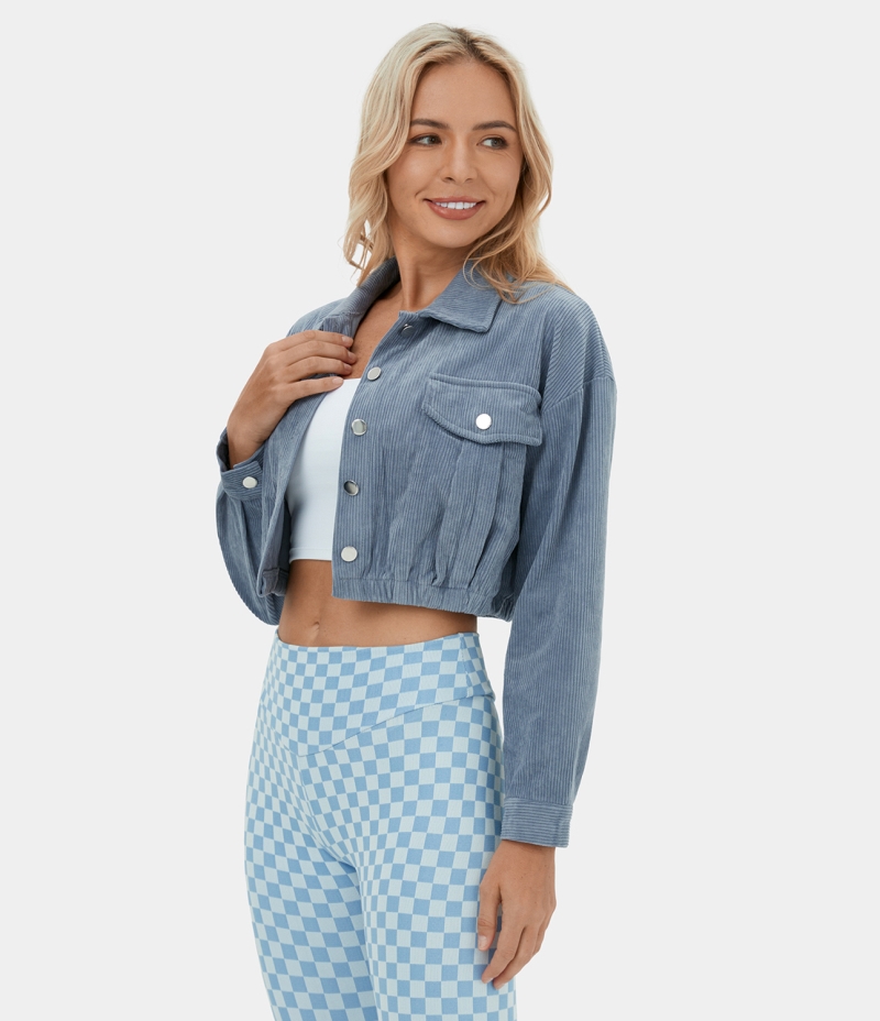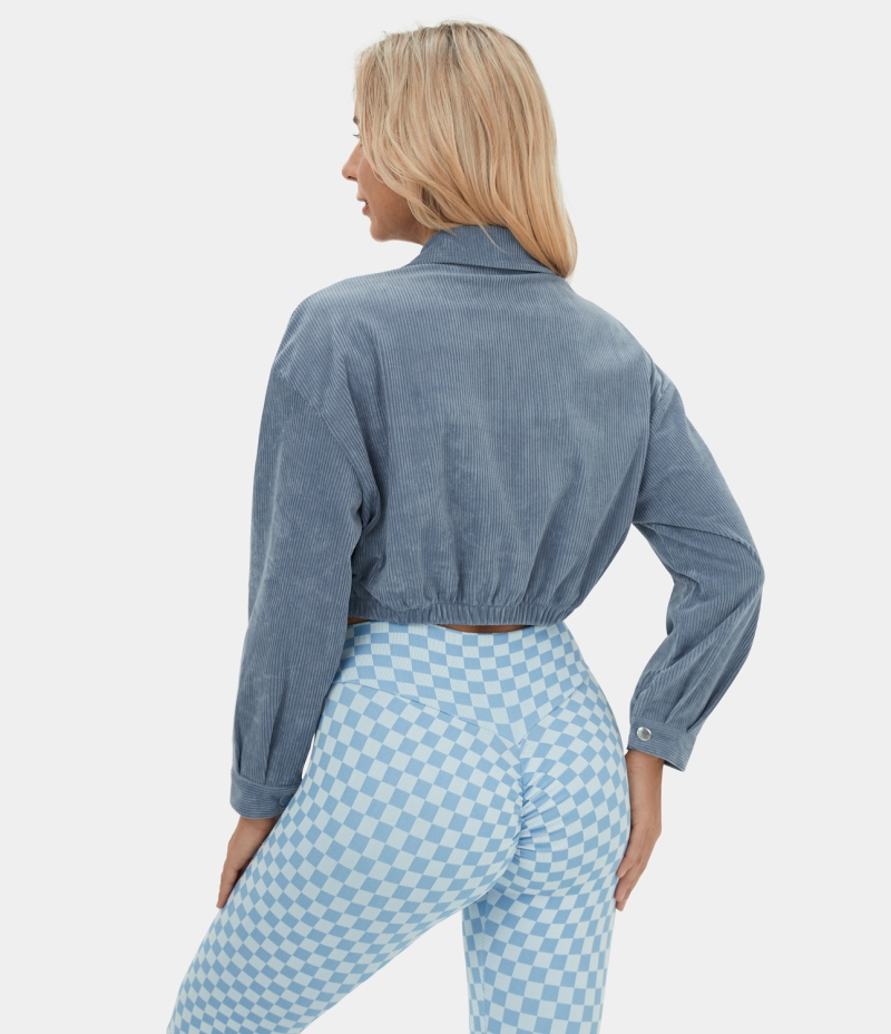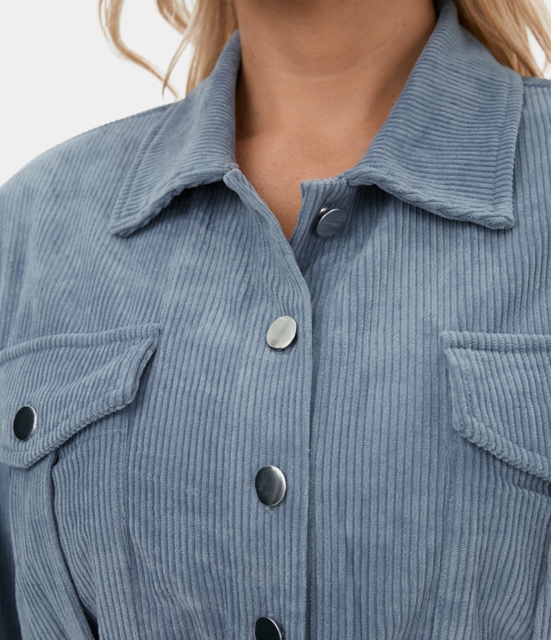 Halara Collared Button Pocket Cropped Corduroy Casual Jacket Women's Tops Dusty Blue | BUMACLR-80