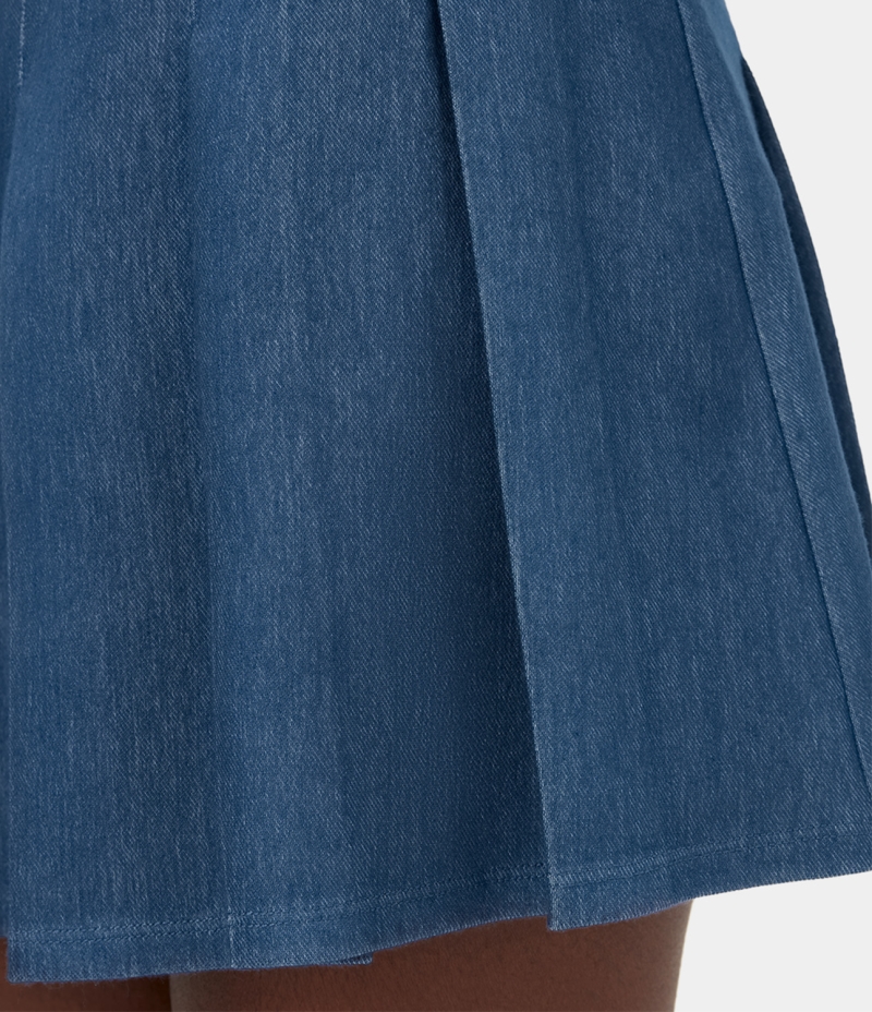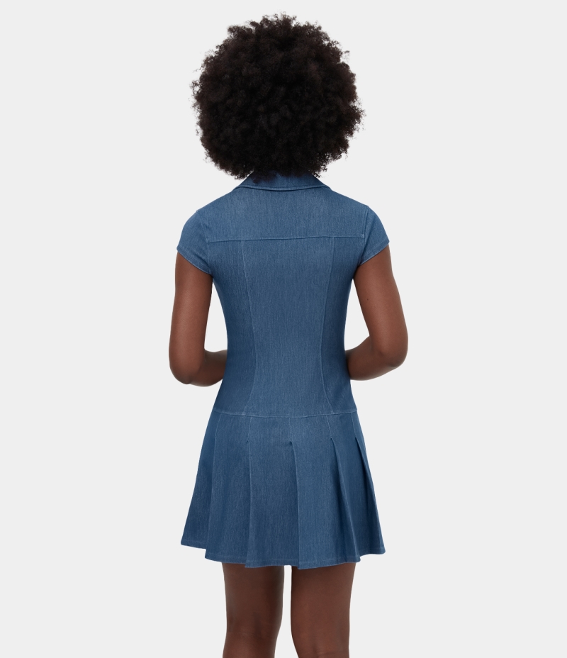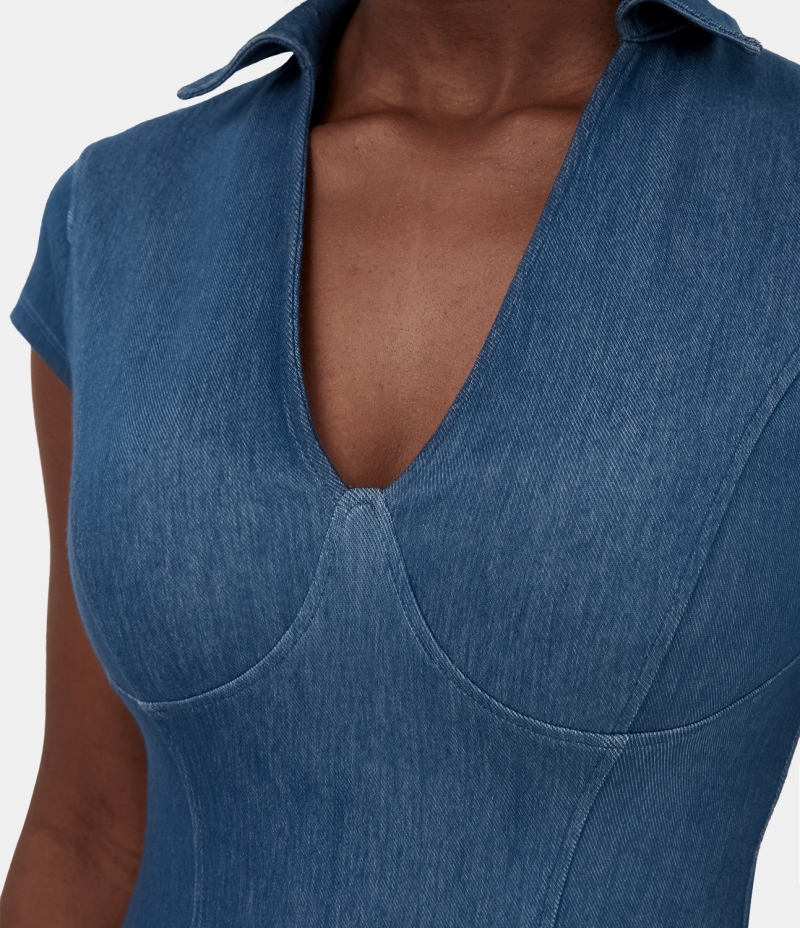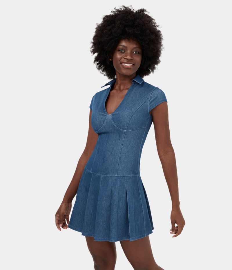 :: Halara Collared Deep V Neck Pleated Stretchy Knit Denim Mini Casual Women's Dress Paeonia Ocean Blue | 719056-OIB