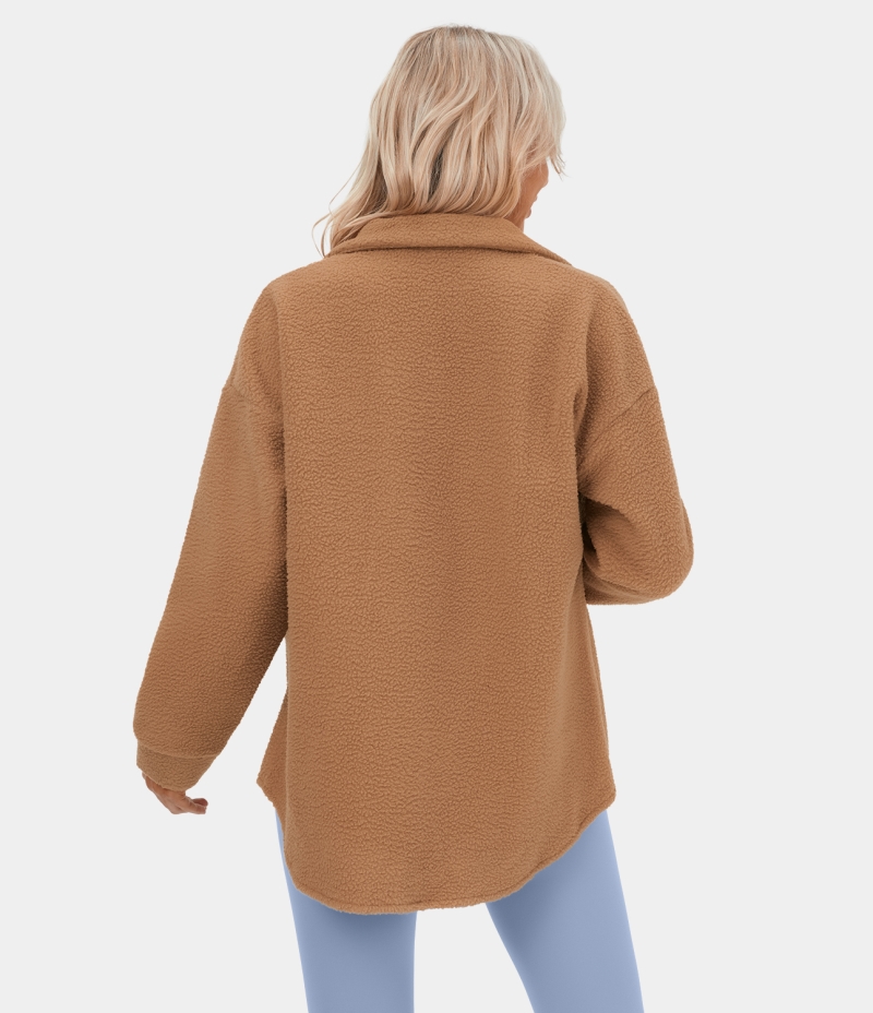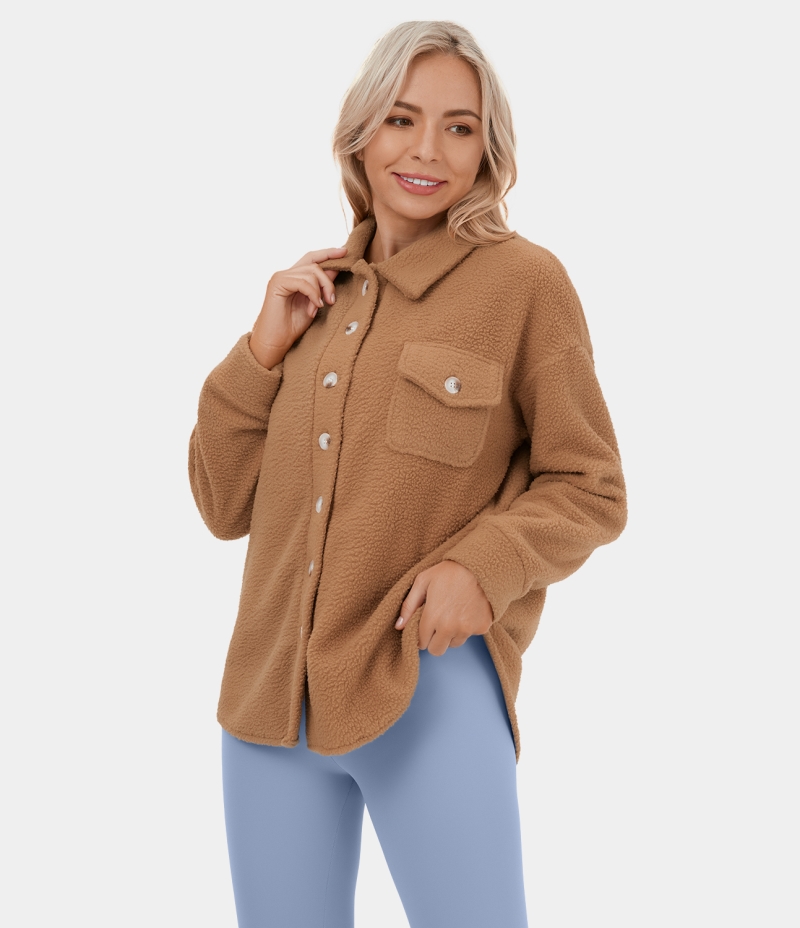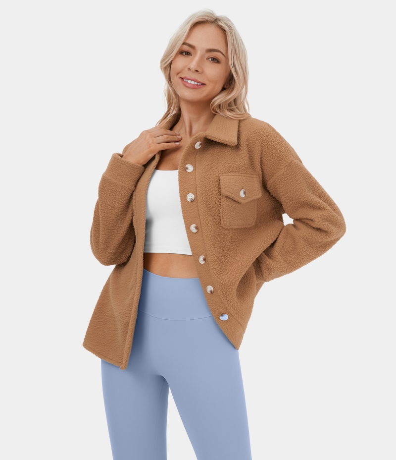 Halara Collared Dropped Shoulder Button Pocket Casual Fleece Jacket Women's Tops Bambi - Brown | FAZHREX-74