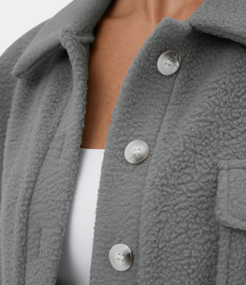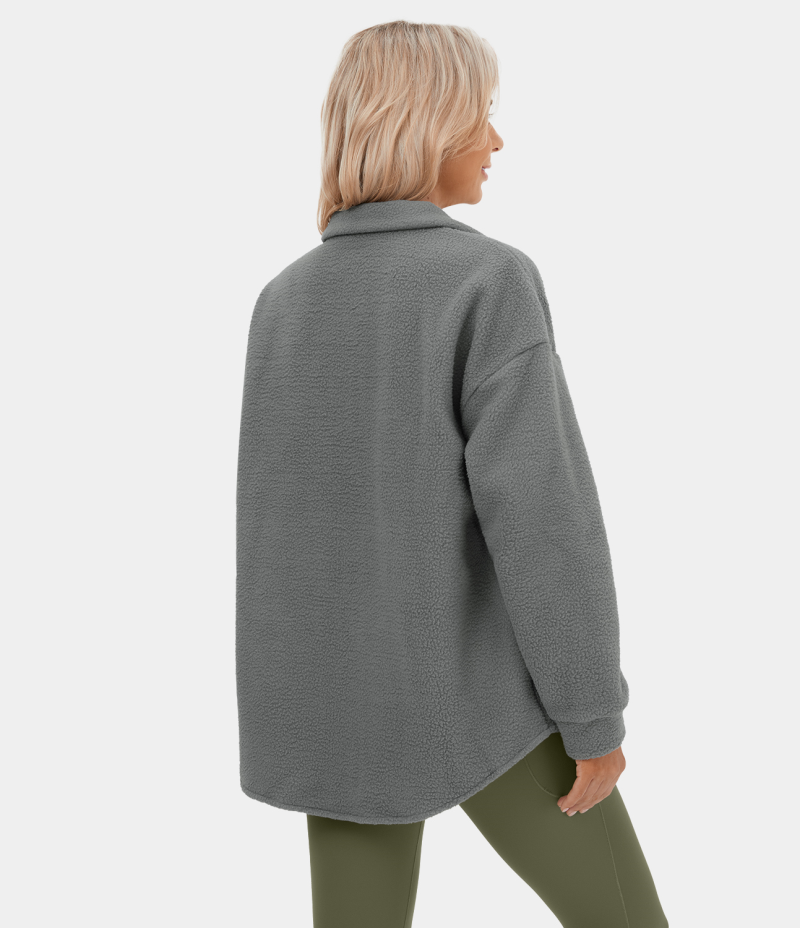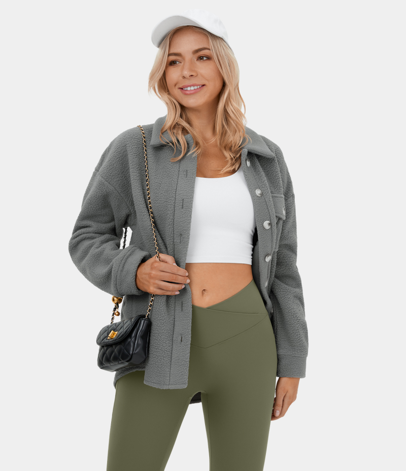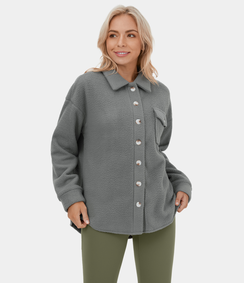 :: Halara Collared Dropped Shoulder Button Pocket Casual Fleece Jacket Women's Tops Moon Mist | IPHZKAJ-46