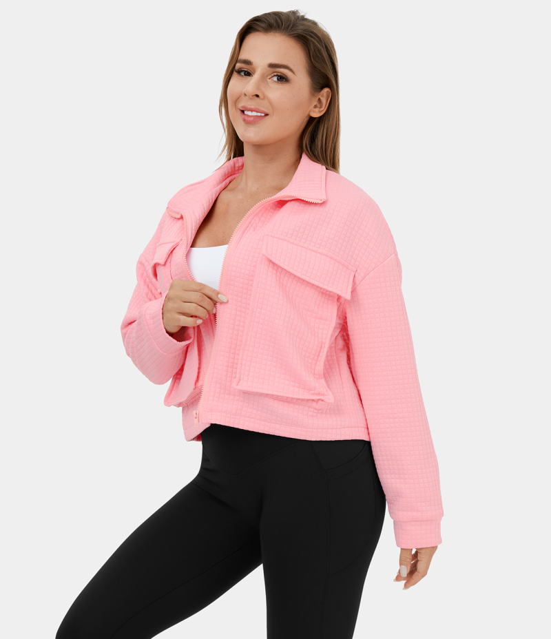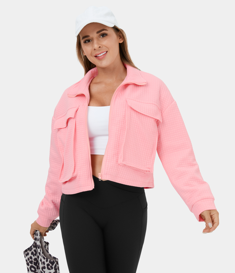 :: Halara Collared Full Zip Flap Pocket Cropped Fleece Casual Cargo Jacket Women's Tops Crystal Rose | VNEUZFM-12
