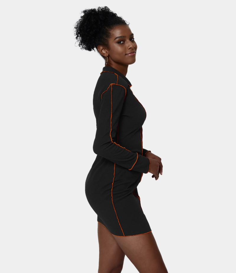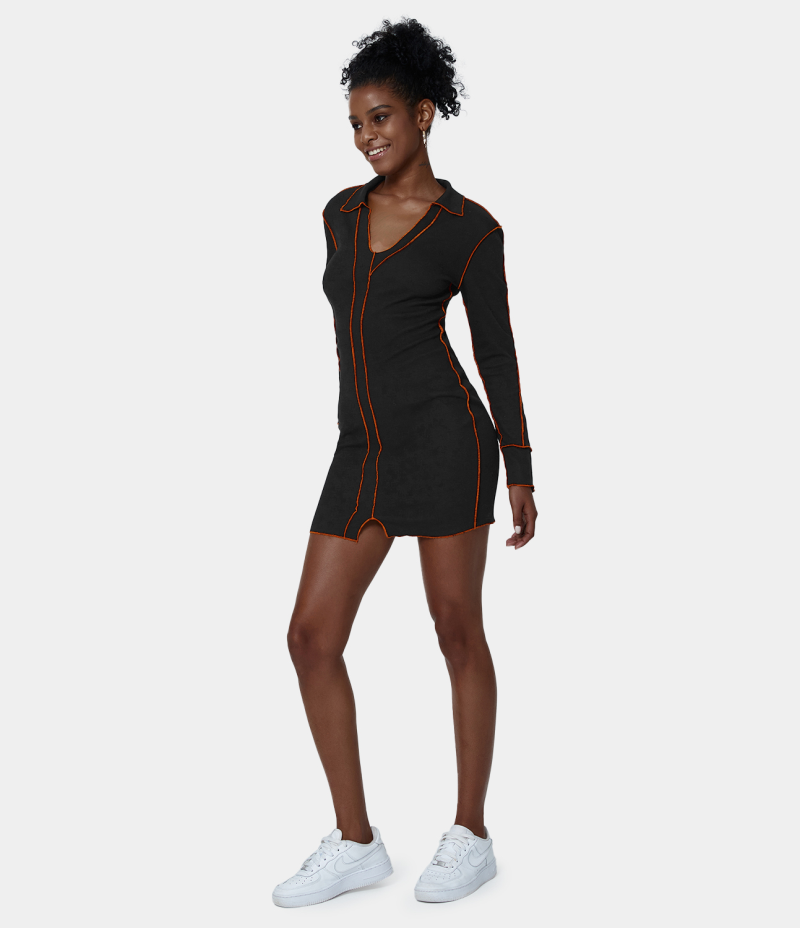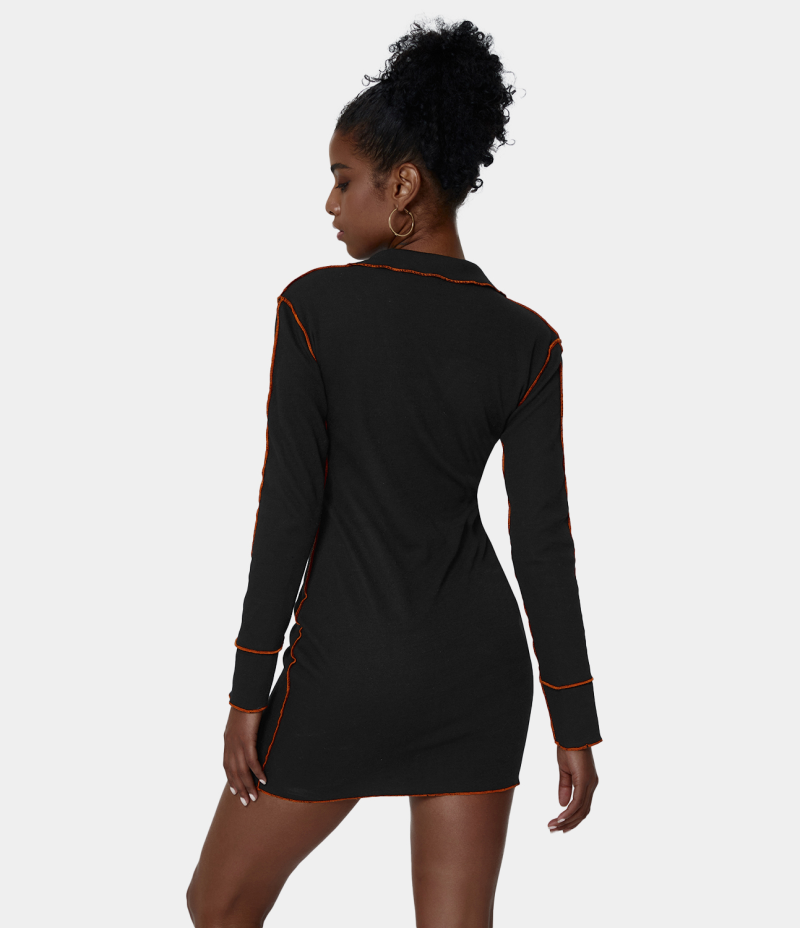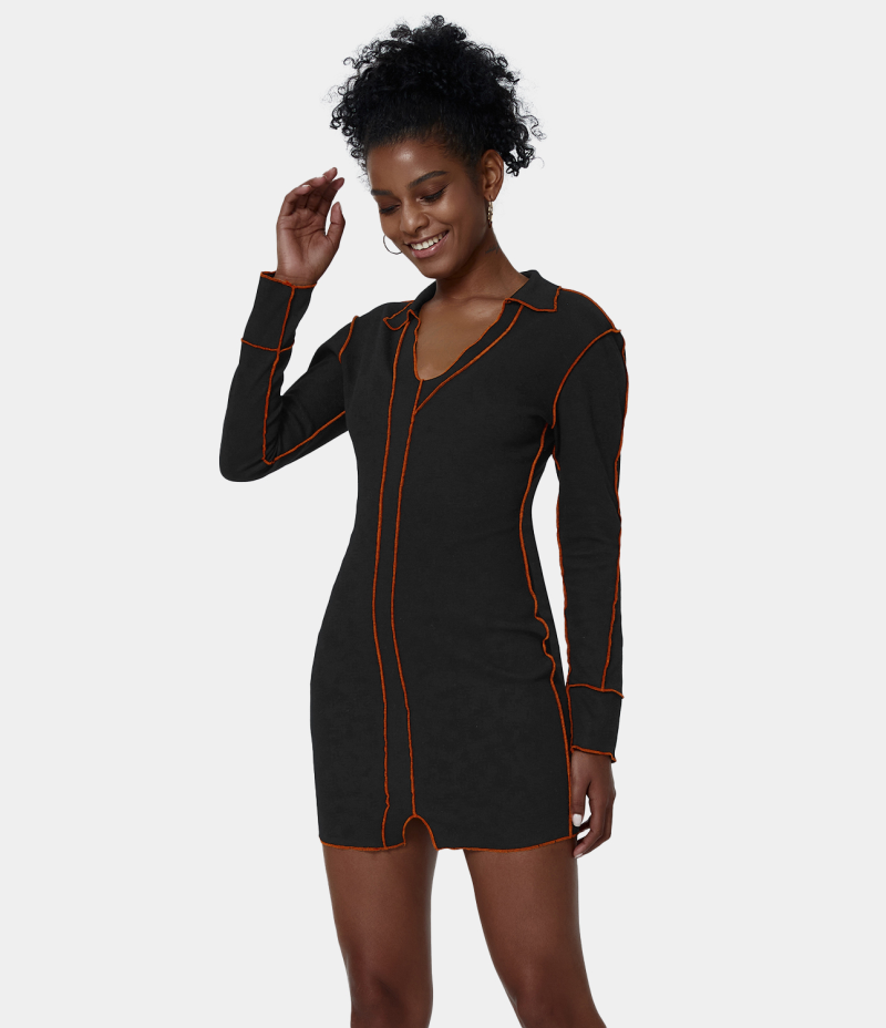 Halara Collared Long Sleeve Split Hem Contrast Trim Mini Women's Dress Black | 716049-FDS