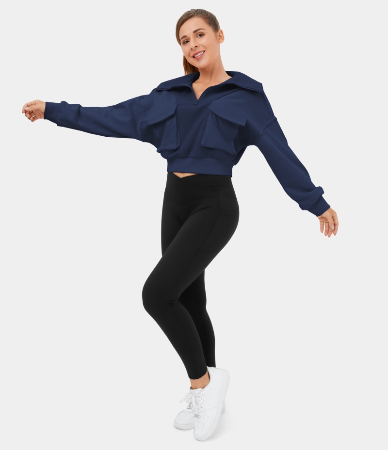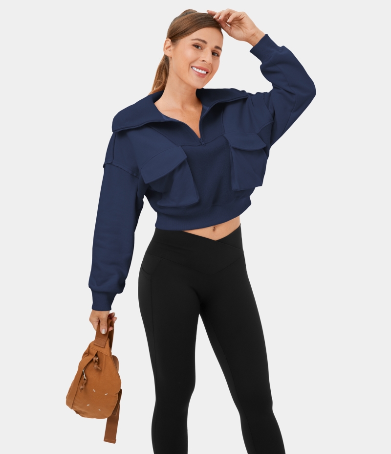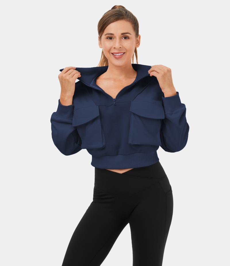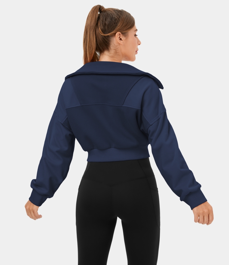 :: Halara Collared Zipper Cargo Pocket Teddy Cropped Fleece Casual Pullover Sweatshirt Women's Tops Navy Blazer | MAXJUVL-39