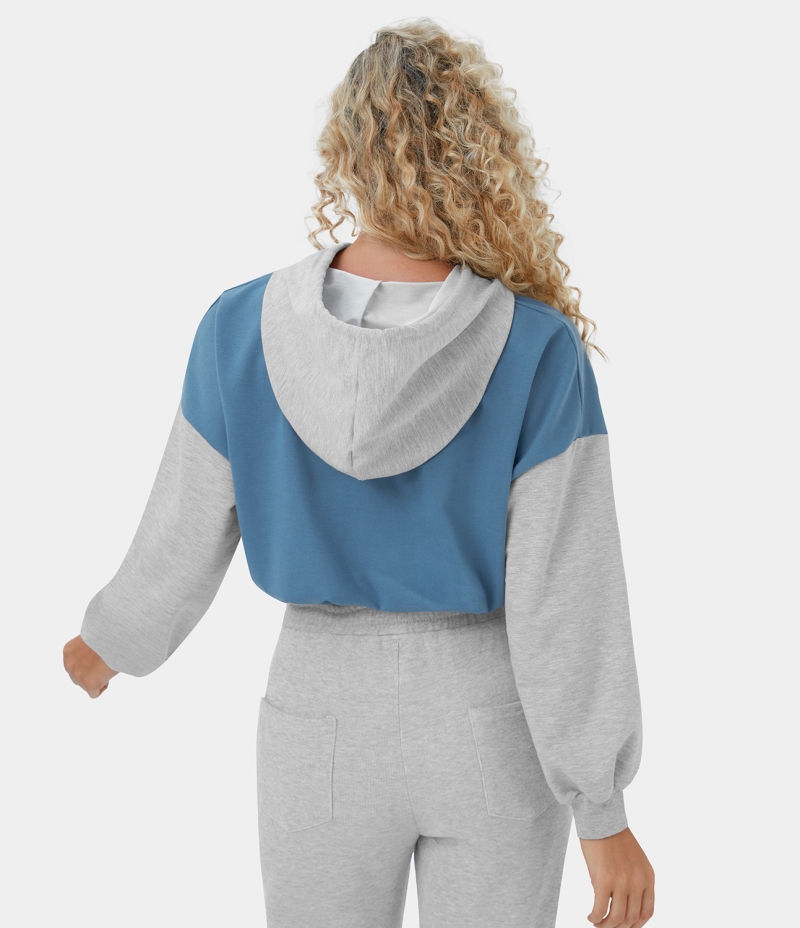 :: Halara Color Block Hooded Drawstring Cropped Casual Sports Sweatshirt Women's Tops Lichen Blue | YPTEGWL-27
