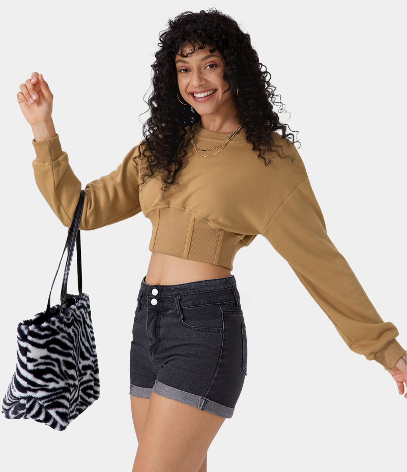 :: Halara Corset Plain Cropped Sweatshirt Women's Tops Mustard Brown | INBPGMY-31