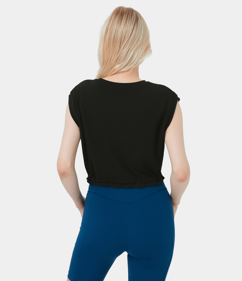 :: Halara Crew Neck Drawstring Hem Cropped Casual Tank Women's Tops Black | OBCZFTH-14