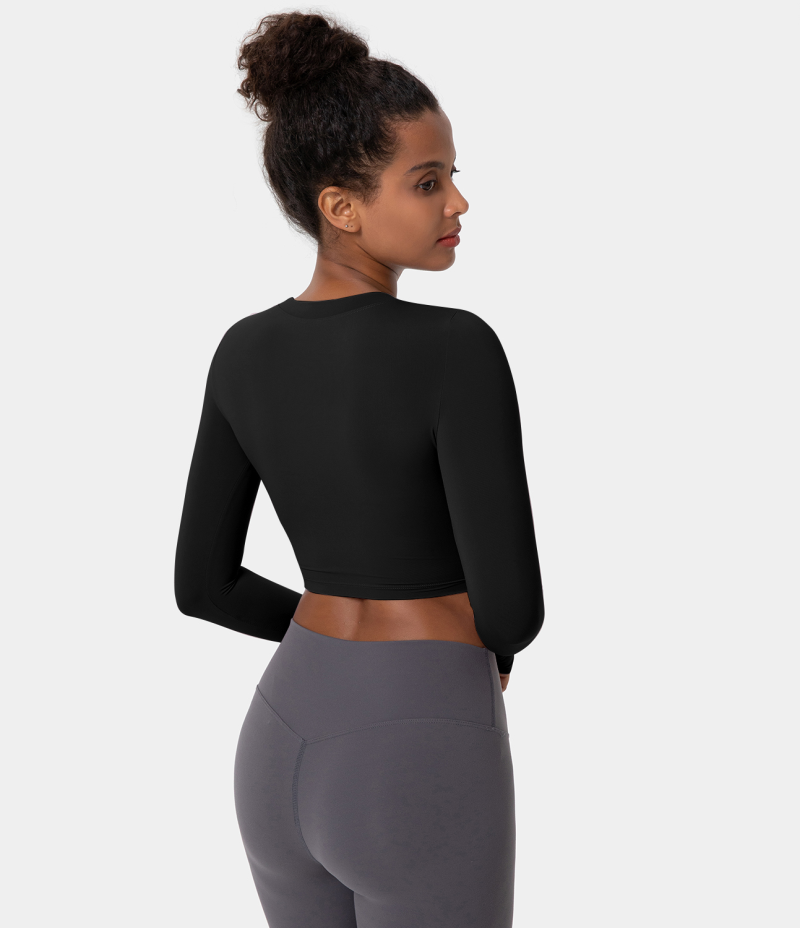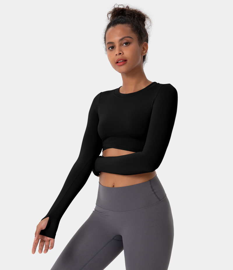 :: Halara Crew Neck Thumb Hole Cut Out Cropped Sports Women's Tops Black | PDOYGUF-56