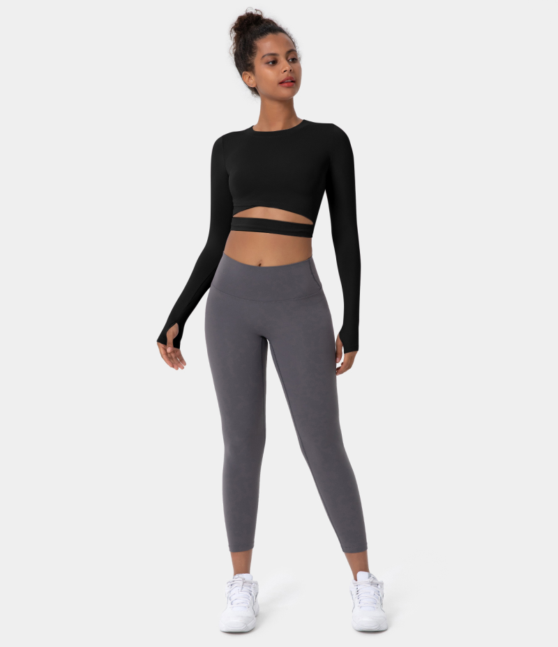 Halara Crew Neck Thumb Hole Cut Out Cropped Sports Women's Tops Black | PDOYGUF-56