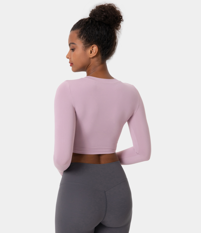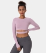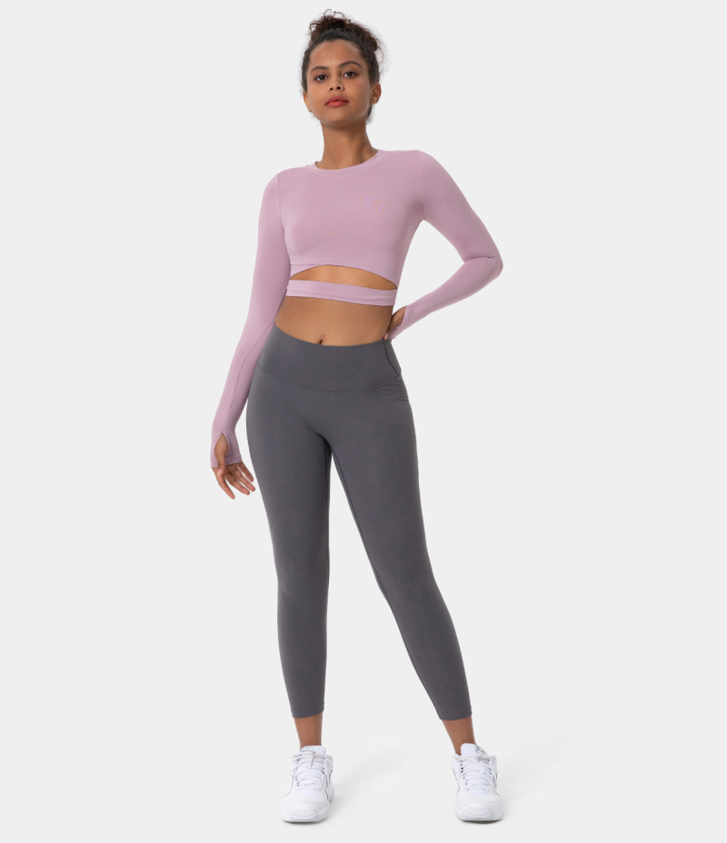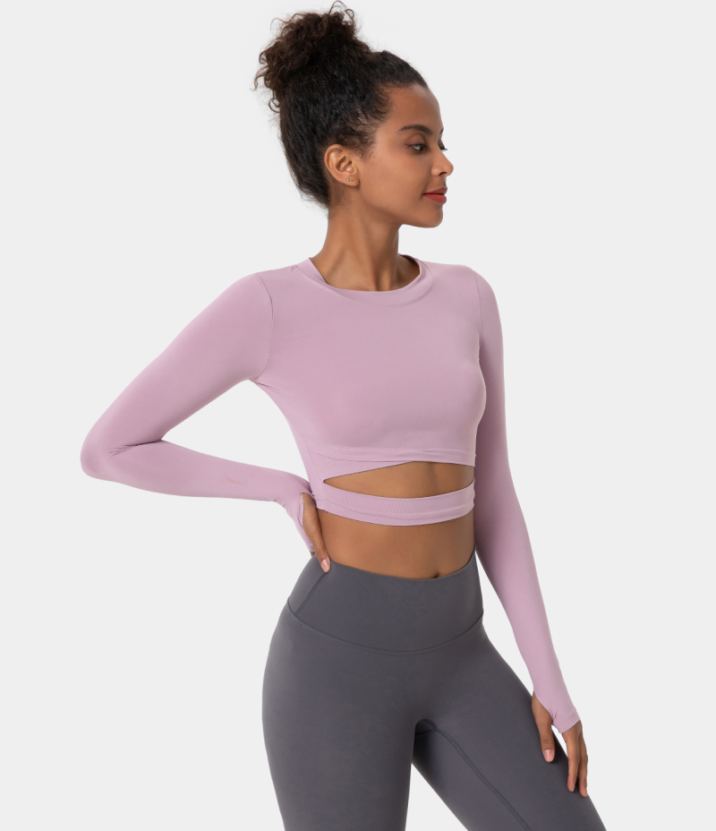 :: Halara Crew Neck Thumb Hole Cut Out Cropped Sports Women's Tops Lilac Purple | OAJHNVF-85