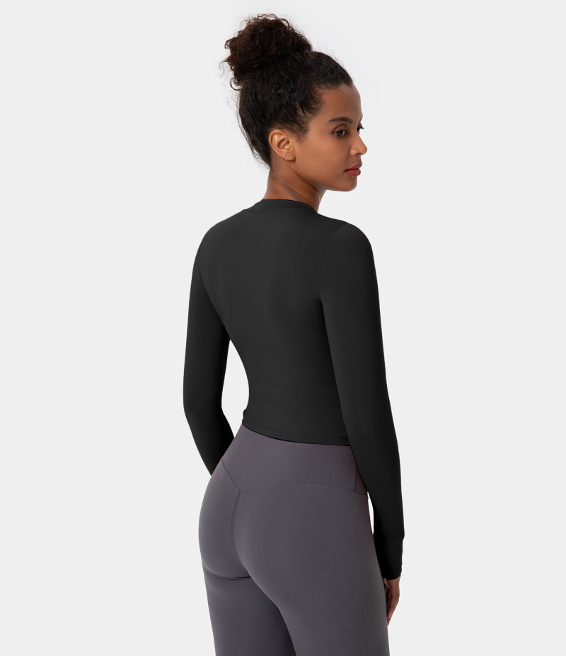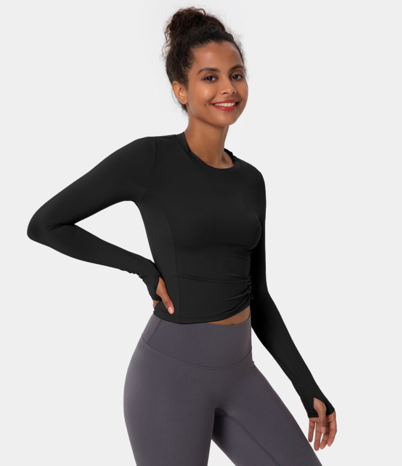 :: Halara Crew Neck Thumb Hole Side Ruched Cropped Sports Women's Tops Black | NGKLWOJ-51