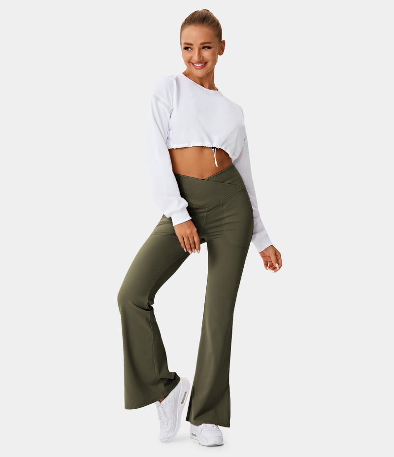 :: Halara Crossover Pocket Split Hem Full Length Flare-Smile Women's Leggings Ivy Green | 507641-CKH
