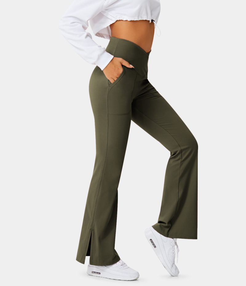 :: Halara Crossover Pocket Split Hem Full Length Flare-Smile Women's Leggings Ivy Green | 683451-ITC