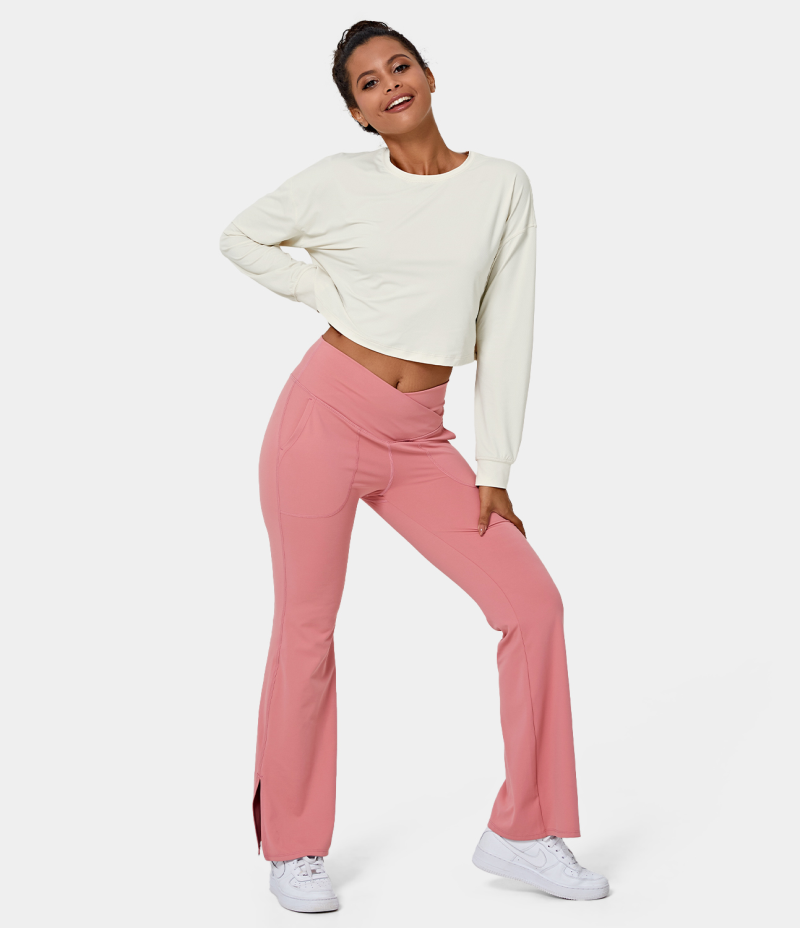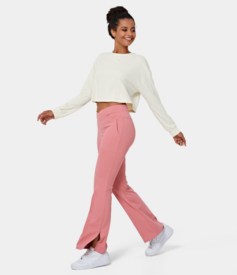 :: Halara Crossover Pocket Split Hem Full Length Flare-Smile Women's Leggings Pink Icing | 095316-QWN