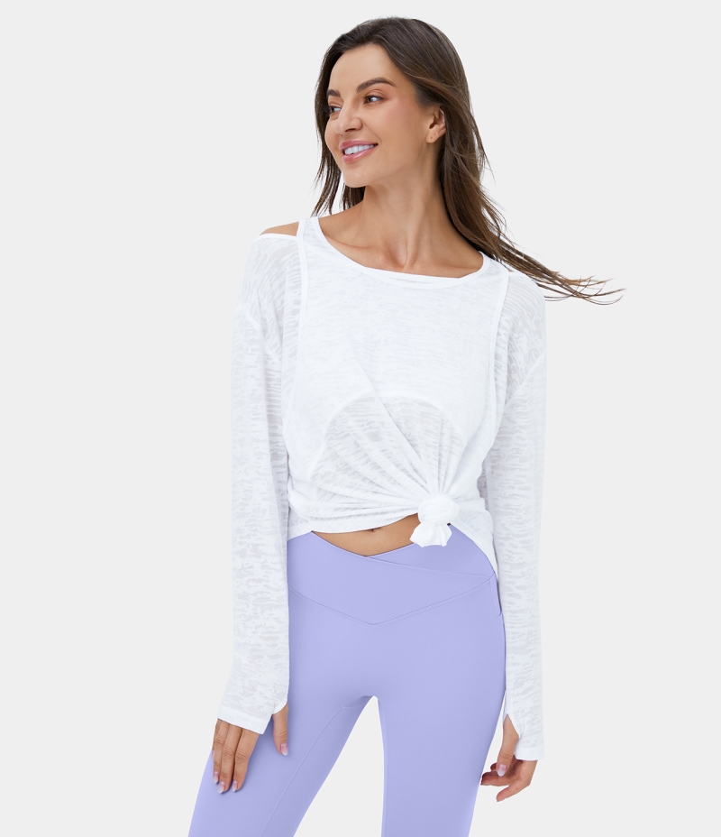 Halara Cut Out Thumb Hole Curved Hem Yoga Sports Women's Tops White | HCBFTJY-02