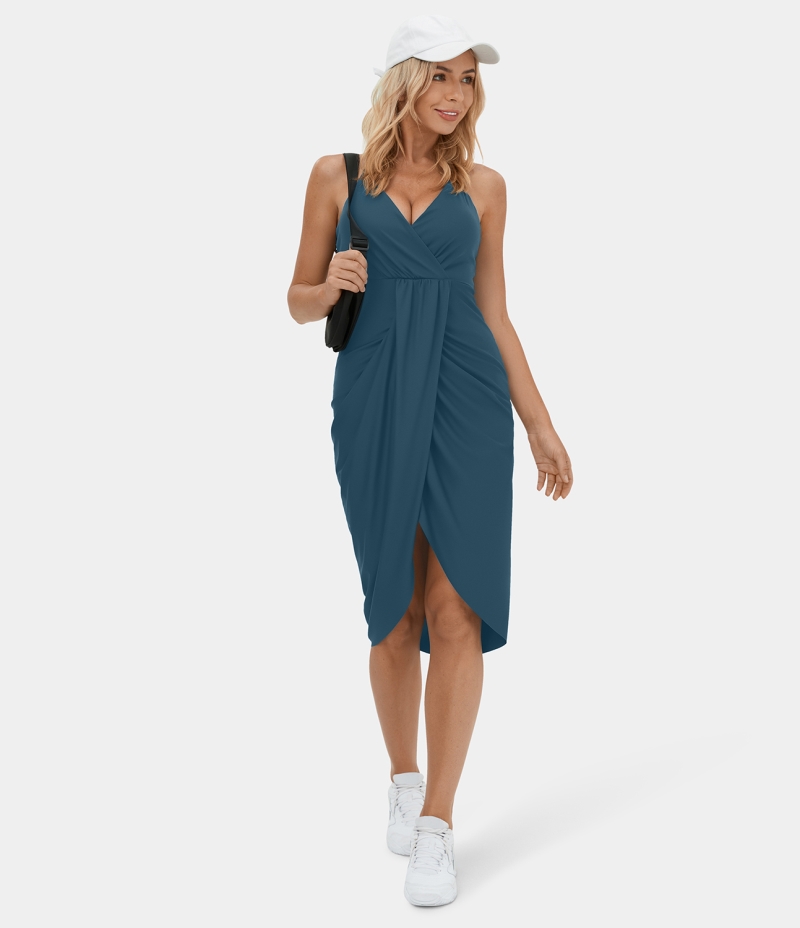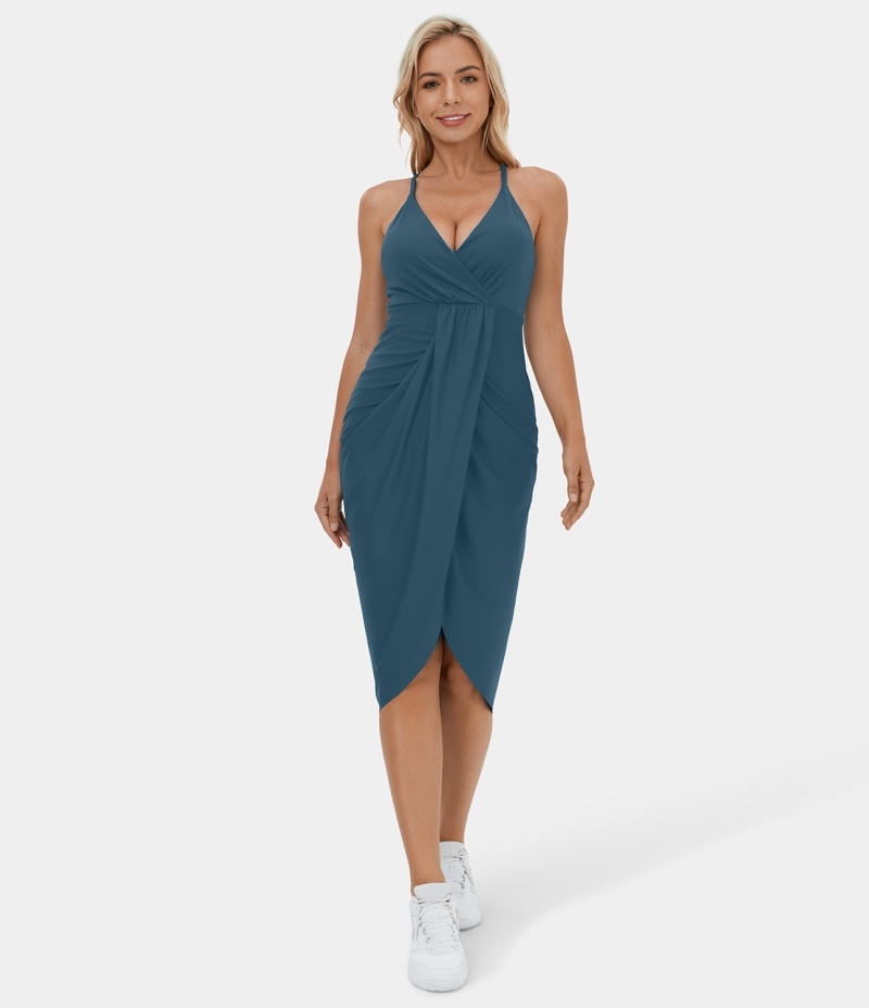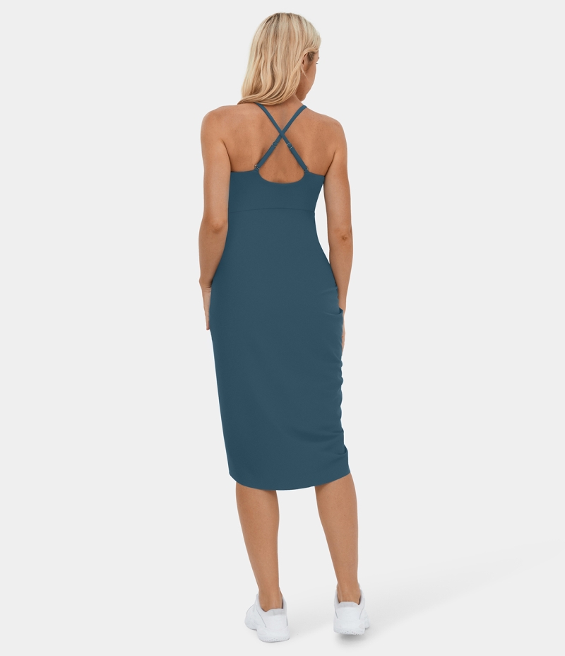 :: Halara Deep V Neck Backless Crisscross Adjustable Strap Draped 2-in-1 Midi Casual Women's Dress Balsam | 349025-OGY