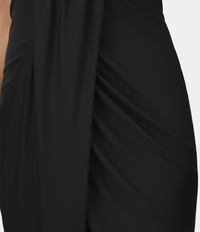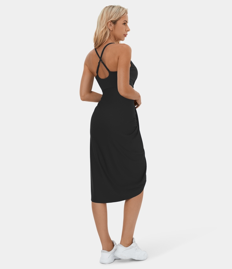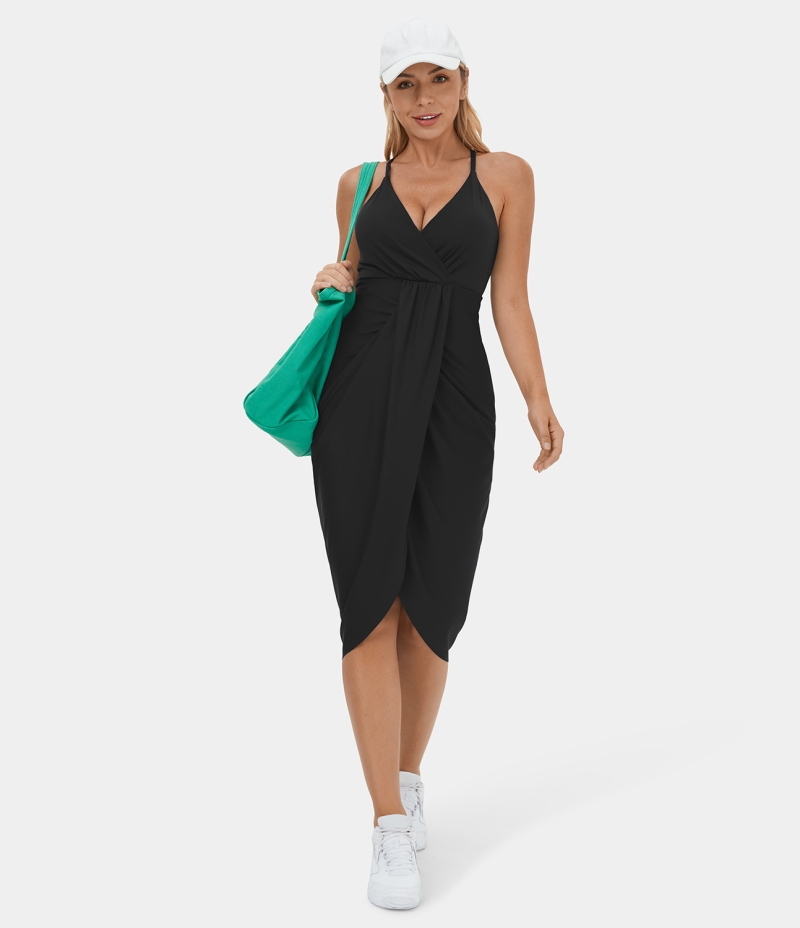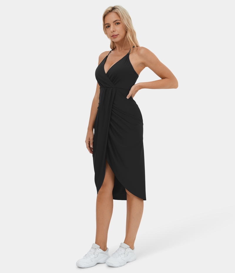 :: Halara Deep V Neck Backless Crisscross Adjustable Strap Draped 2-in-1 Midi Casual Women's Dress Black | 840931-DEZ