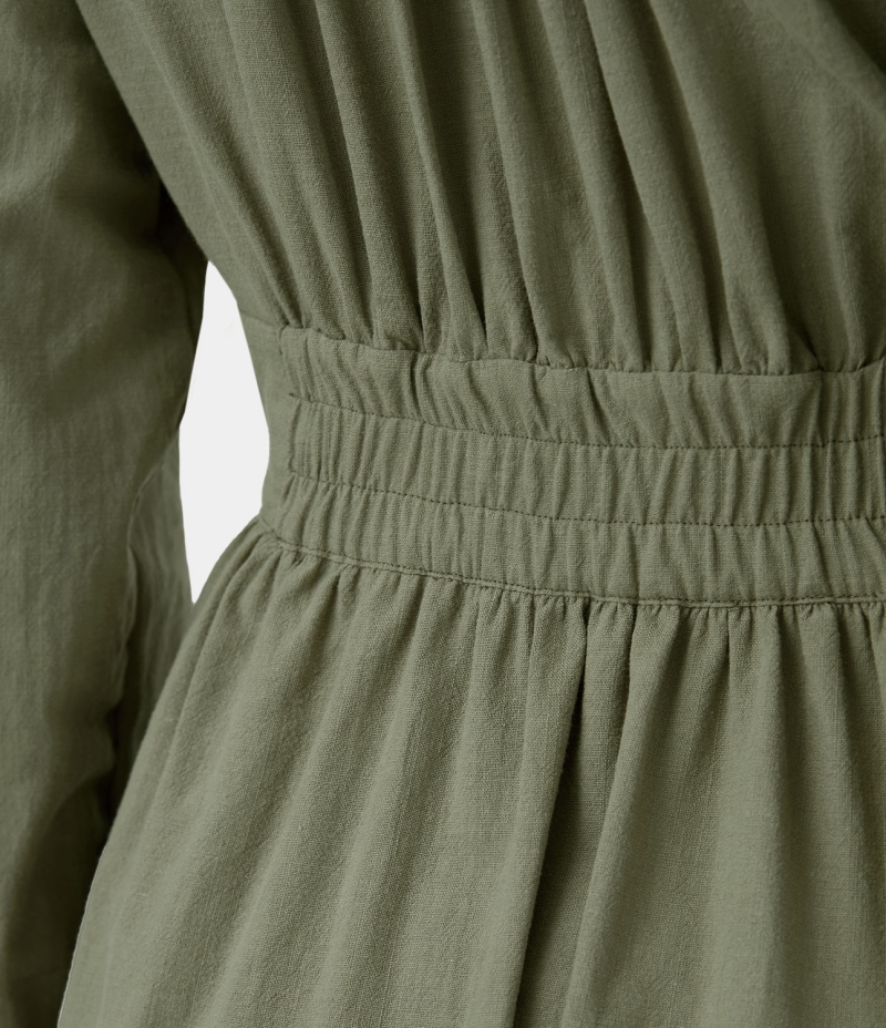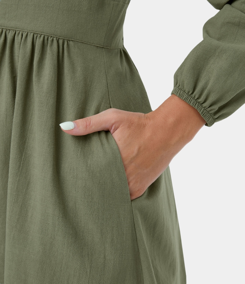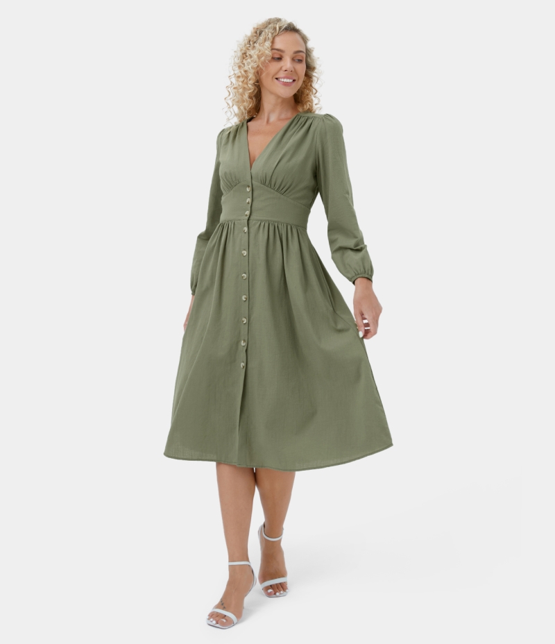 :: Halara Deep V Neck Button Side Pocket Ruched Casual Midi Women's Dress Loden Green | 319802-EBN