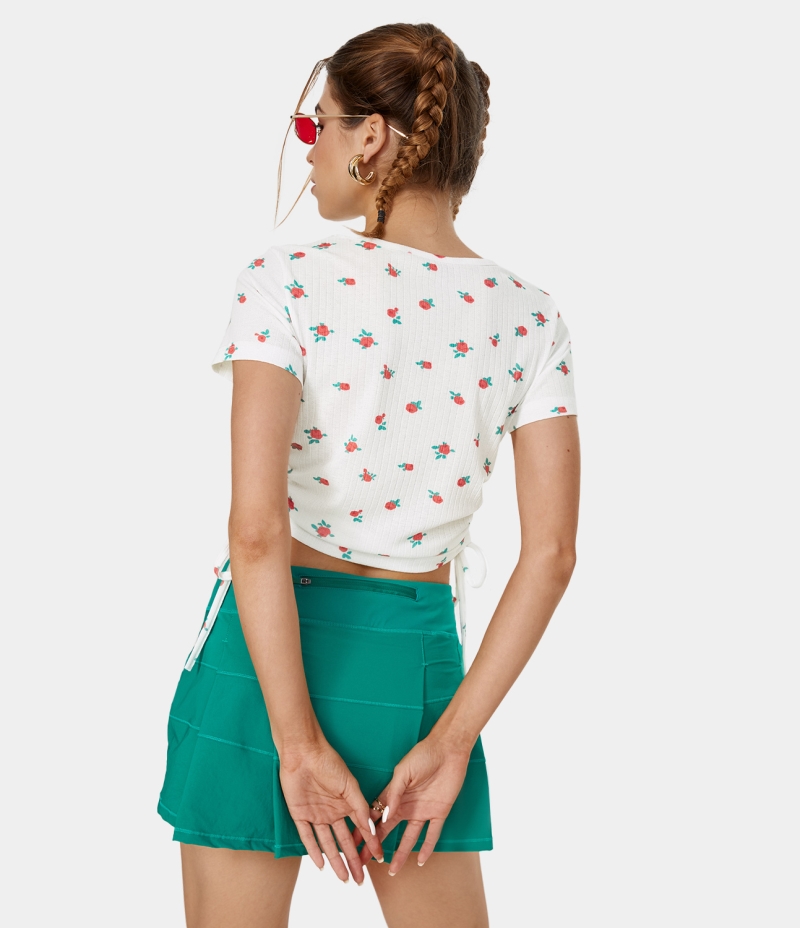 :: Halara Ditsy Floral Short Sleeve Side Drawstring Cropped Casual T-Shirt Women's Tops Red Rose Flowers | YLTBQHG-87
