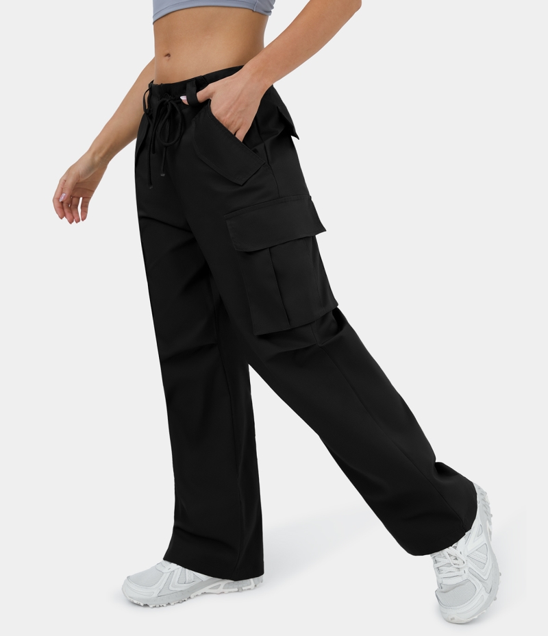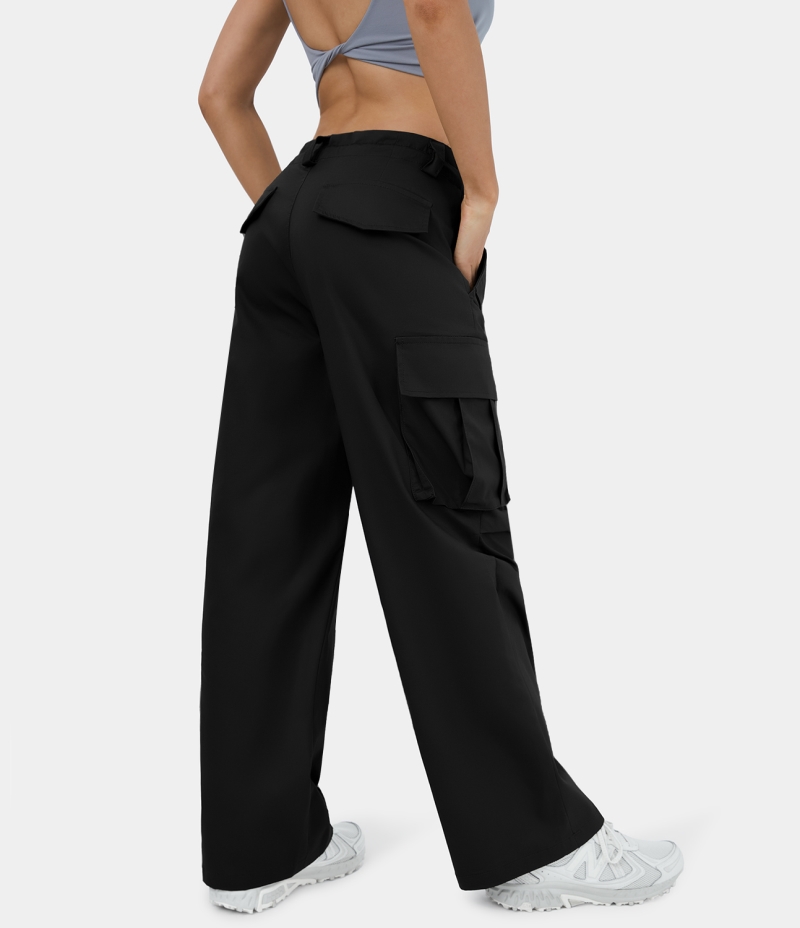 Halara Drawstring Button Zip Multi Pockets Wide Leg Casual Cargo Women's Pants Black | 586793-XZH