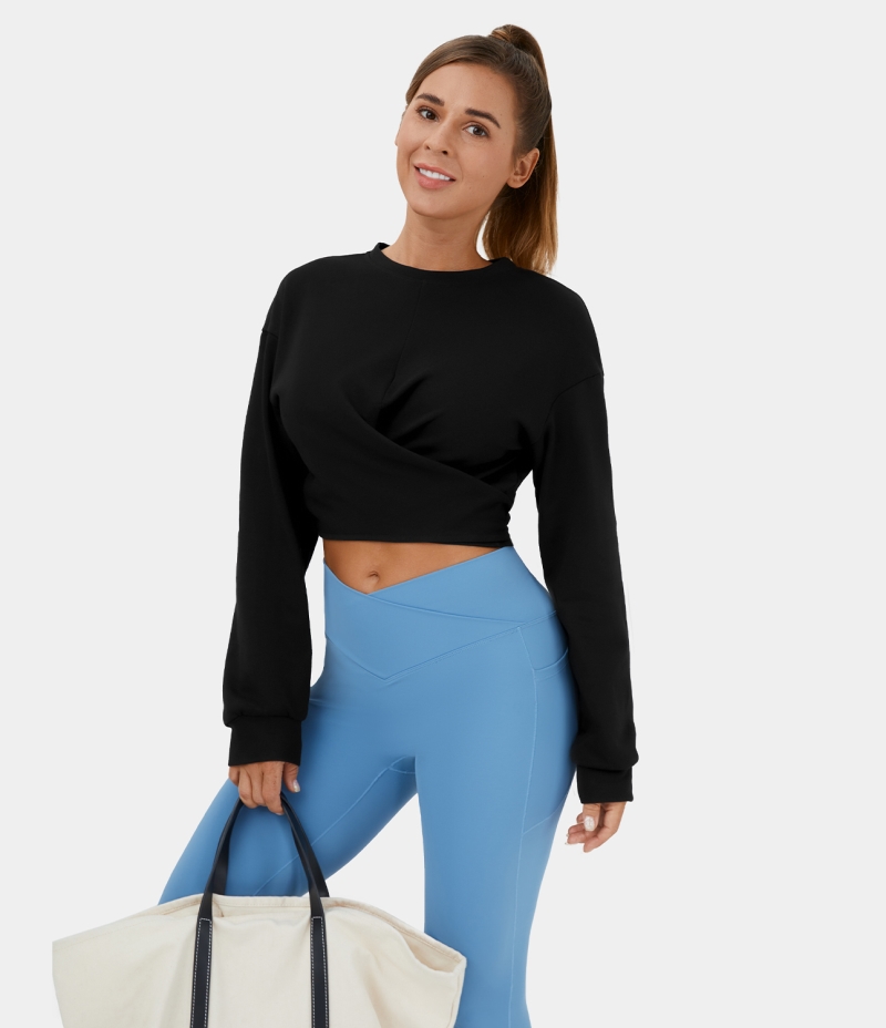 Halara Dropped Shoulder Lace Up Cropped Casual Sports Sweatshirt Women's Tops Black | RAYIKCF-84