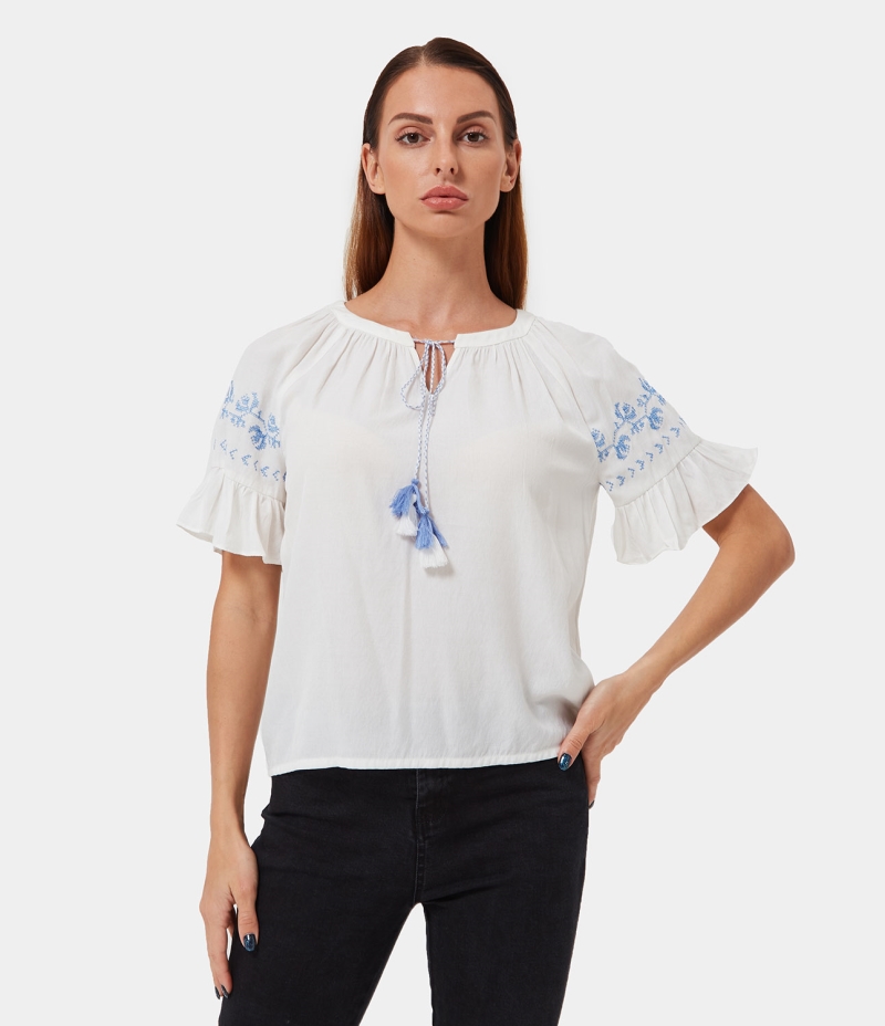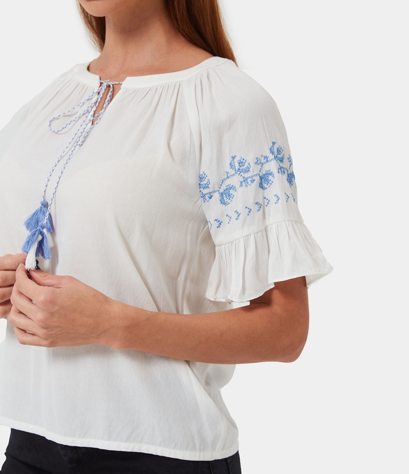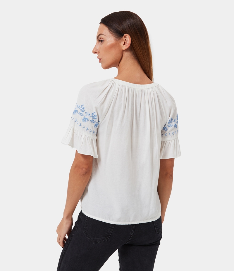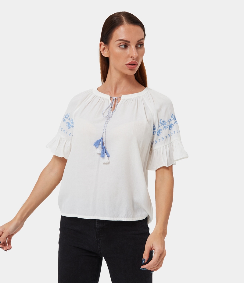 :: Halara Embroidery Half Sleeve Blouse Women's Tops White | TWEQUFA-29