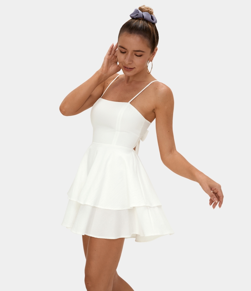 :: Halara Everyday Adjustable Straps Tie Back Tiered Ruffle Mini Women's Dress White | 640237-KJR