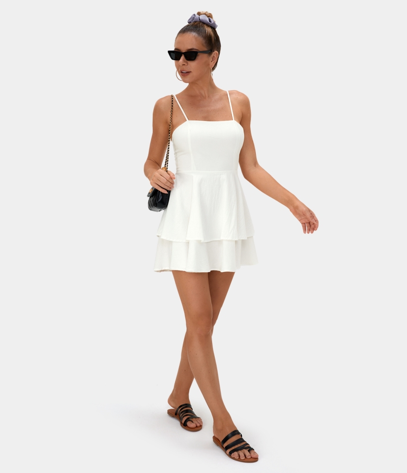 Halara Everyday Adjustable Straps Tie Back Tiered Ruffle Mini Women's Dress White | 640237-KJR