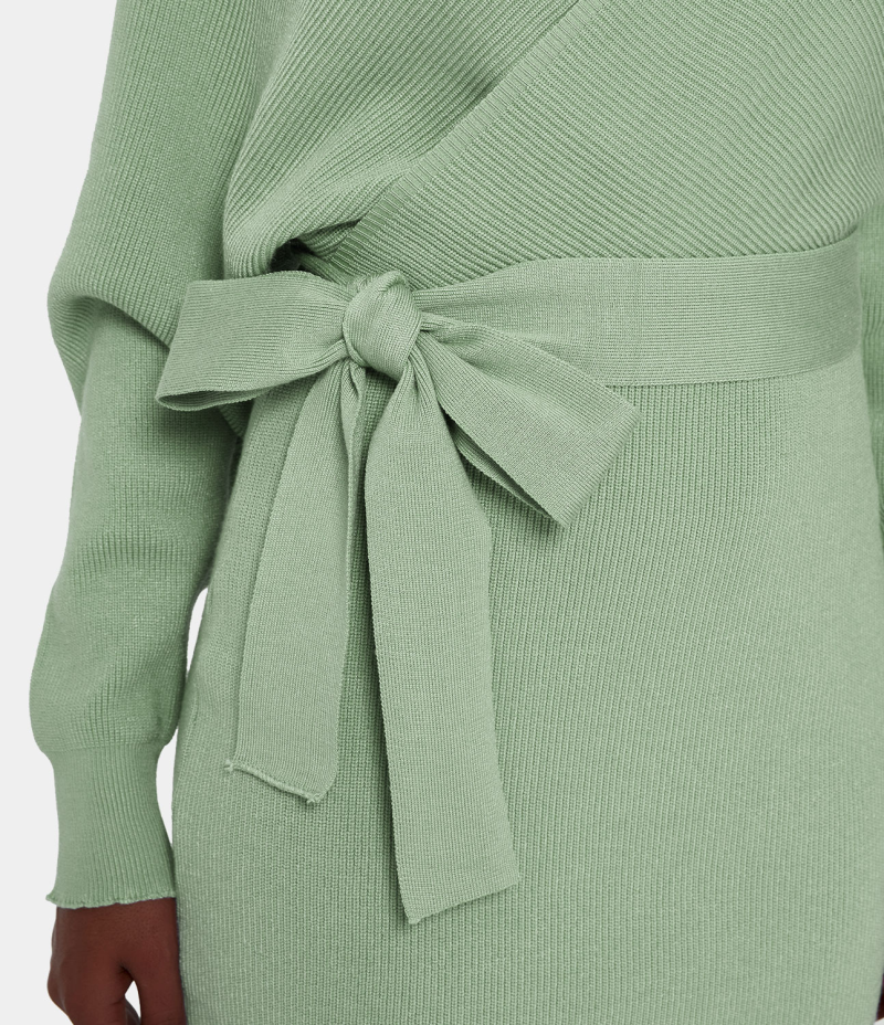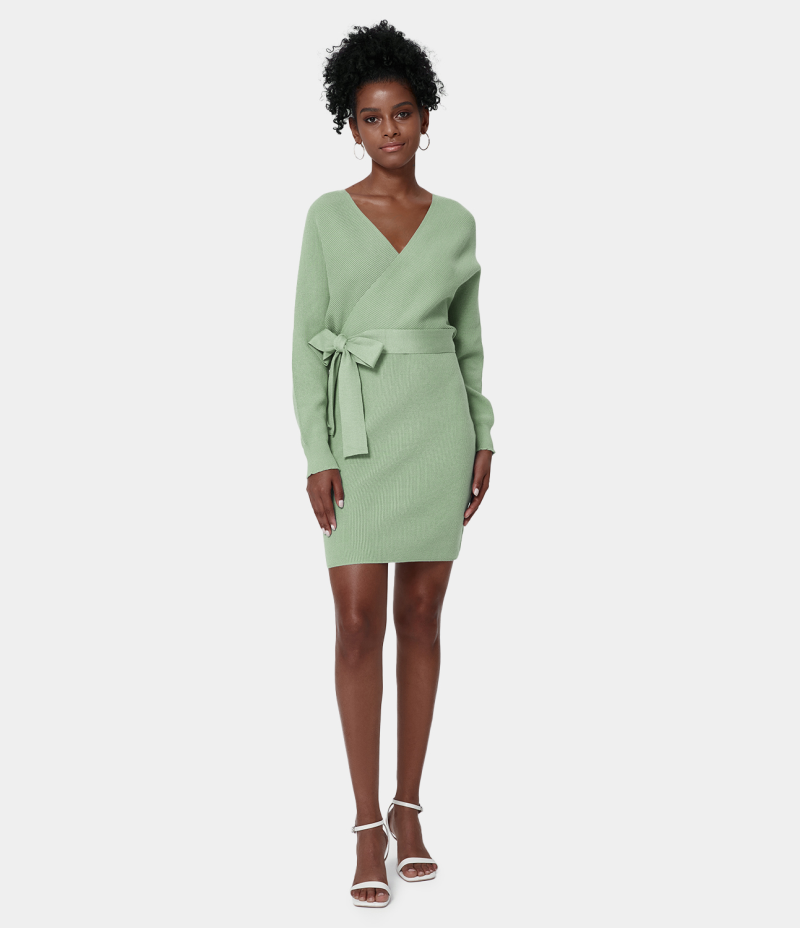 :: Halara Everyday Deep V Neck Lace Up Mini Knitted Women's Dress Seagrass | 385264-FIE