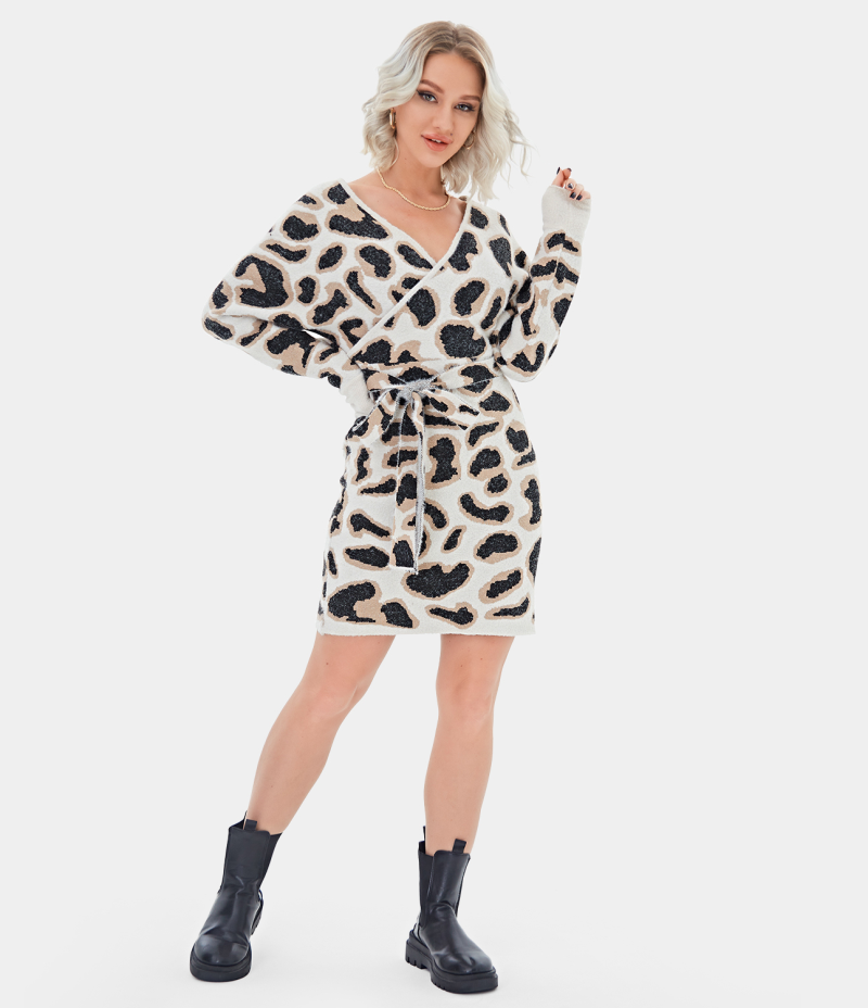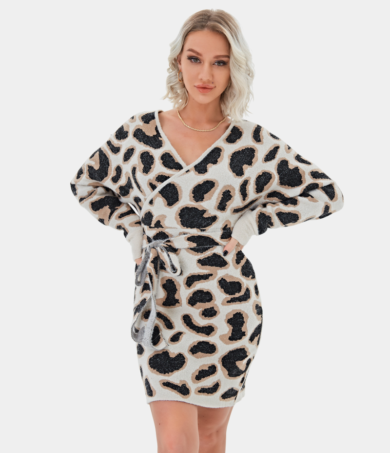 :: Halara Everyday Deep V Neck Lace Up Mini Knitted Women's Tops Leopard Print | UYCDNAZ-37