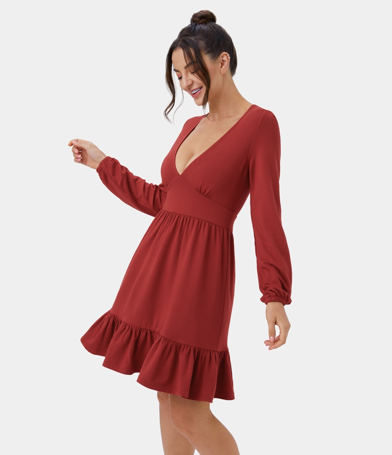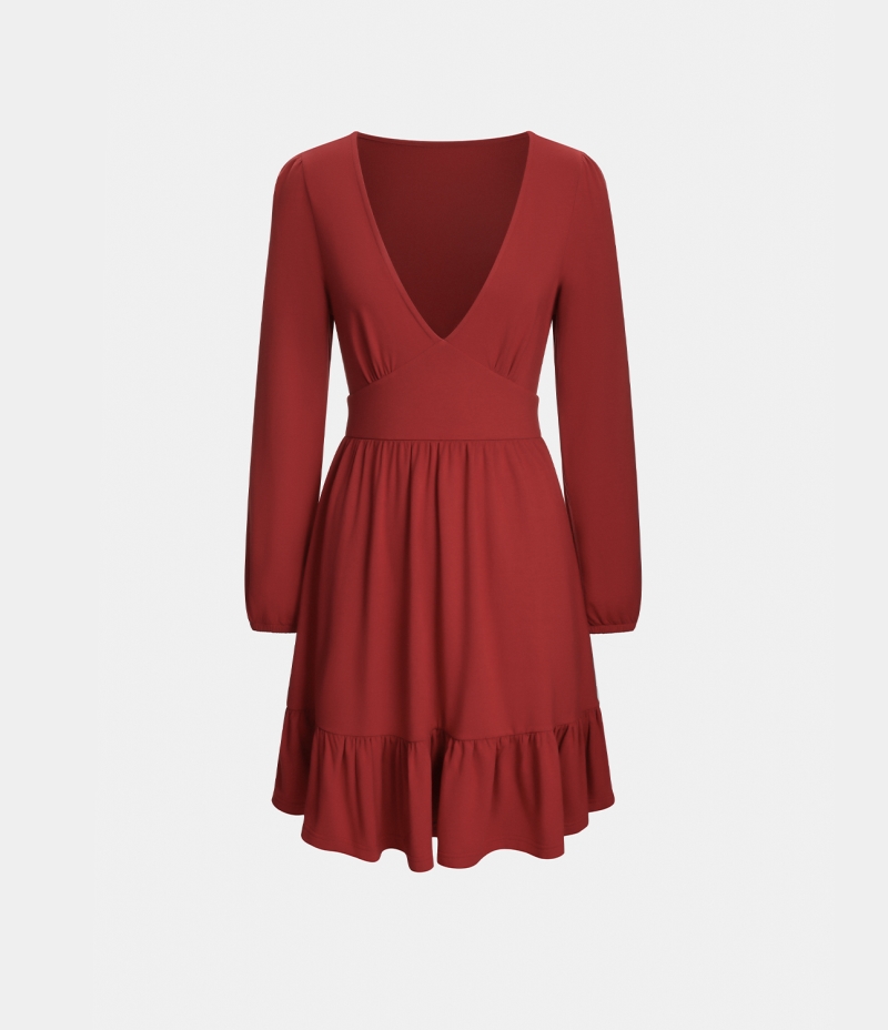Halara Everyday Deep V Neck Ruffled Hem Mini Women's Dress Red Ochre | 103486-KNI