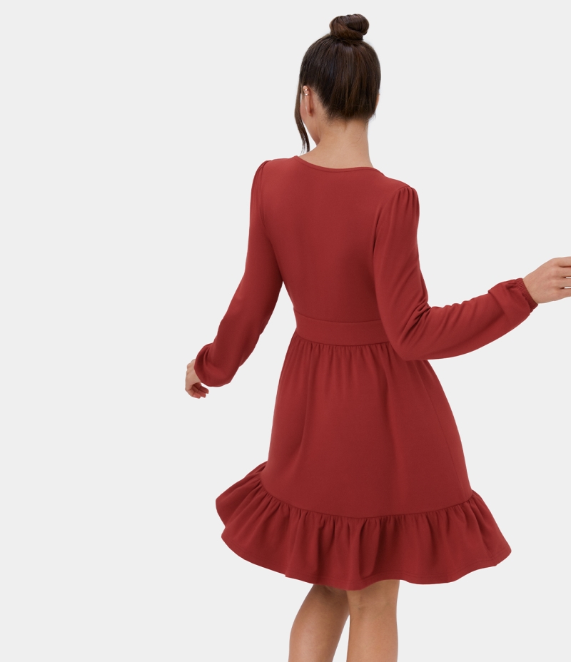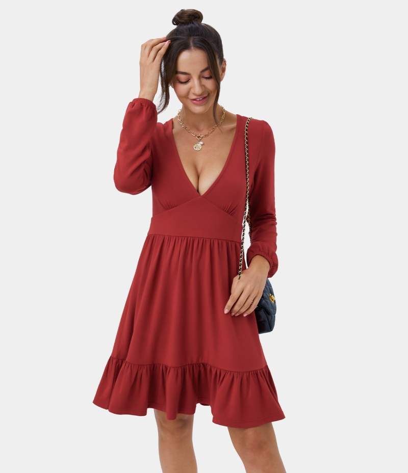 :: Halara Everyday Deep V Neck Ruffled Hem Mini Women's Dress Red Ochre | 928634-GQT