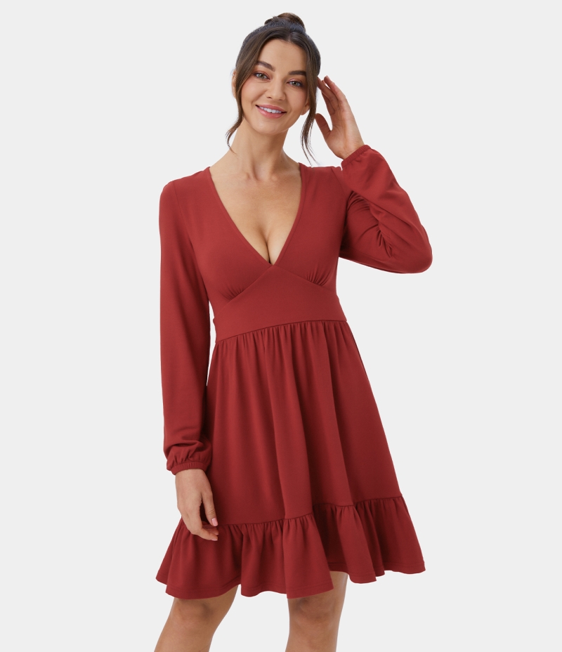 Halara Everyday Deep V Neck Ruffled Hem Mini Women's Dress Red Ochre | 928634-GQT