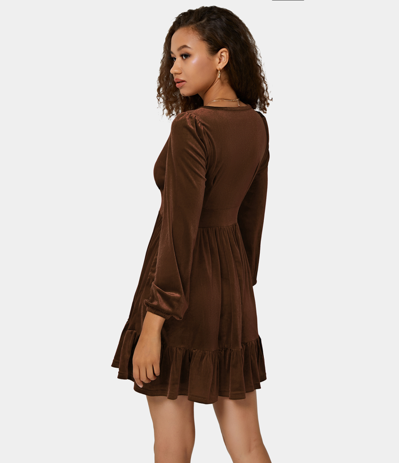 :: Halara Everyday Deep V Neck Ruffled Hem Velvet Mini Chill Women's Dress Chicory Coffee | 265091-BMQ