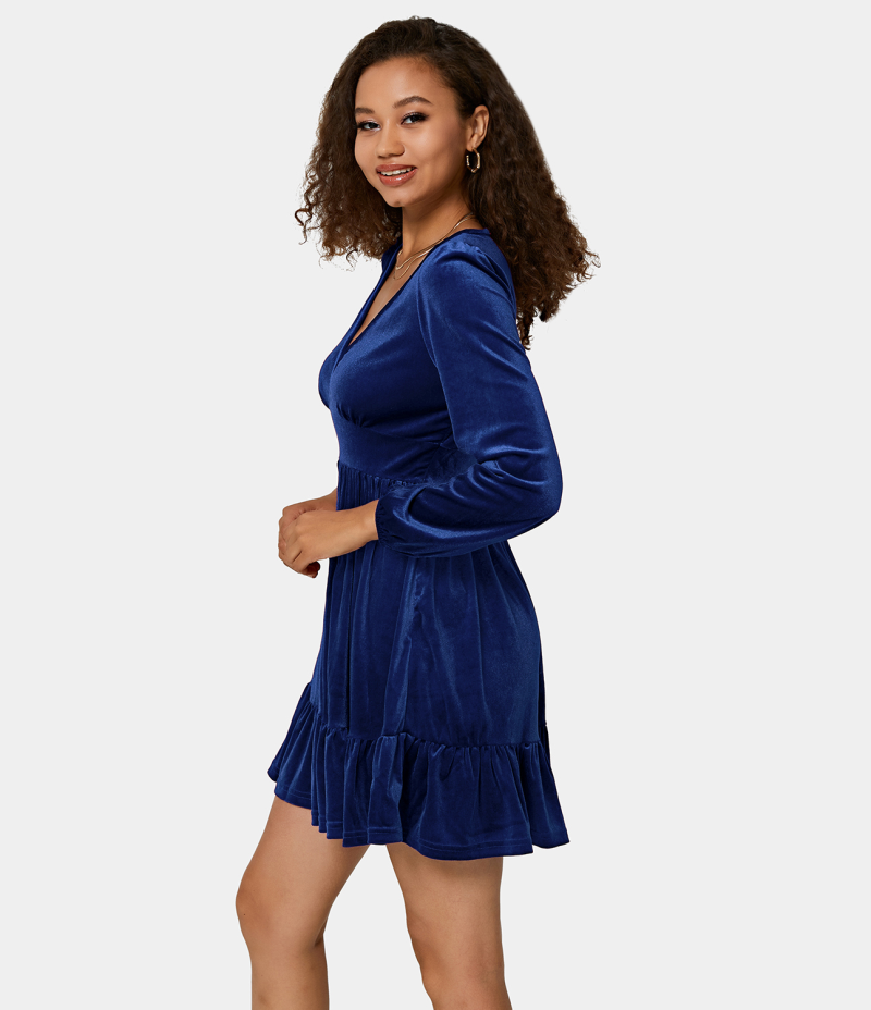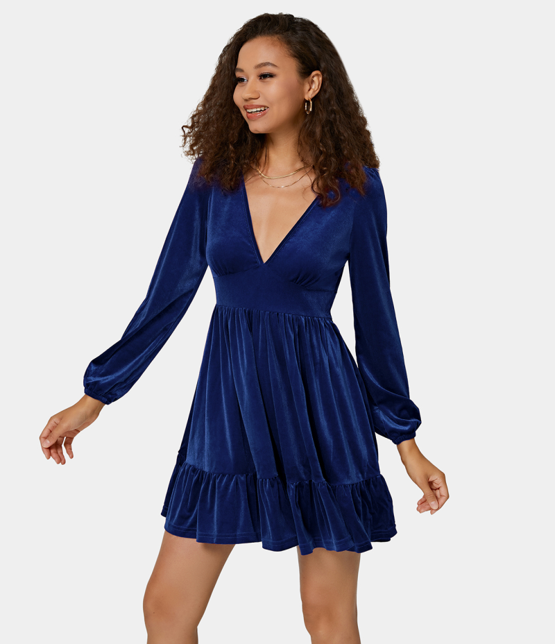 :: Halara Everyday Deep V Neck Ruffled Hem Velvet Mini Chill Women's Dress Deep Blue | 904752-LBY