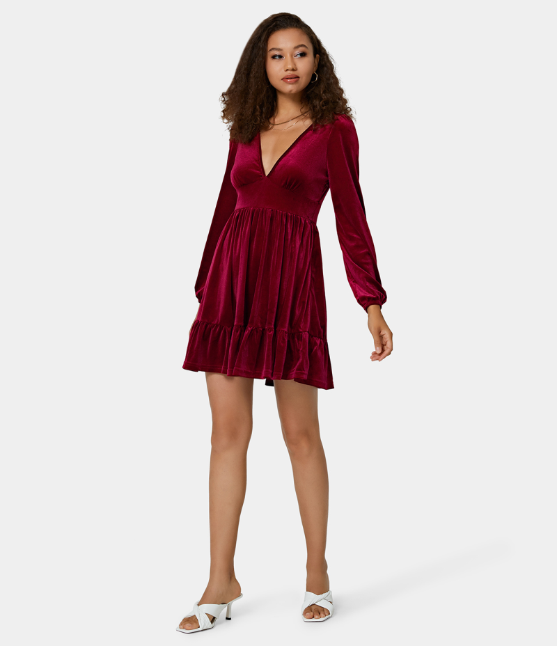 :: Halara Everyday Deep V Neck Ruffled Hem Velvet Mini Chill Women's Dress Deep Wine | 874259-PAU