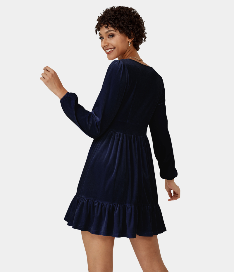:: Halara Everyday Deep V Neck Ruffled Hem Velvet Mini Chill Women's Dress Denim Blue | 401328-UNG
