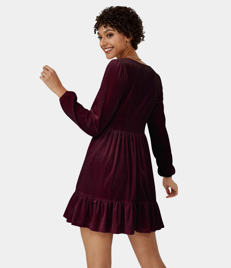 :: Halara Everyday Deep V Neck Ruffled Hem Velvet Mini Chill Women's Dress Raisin | 607153-FCZ